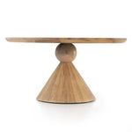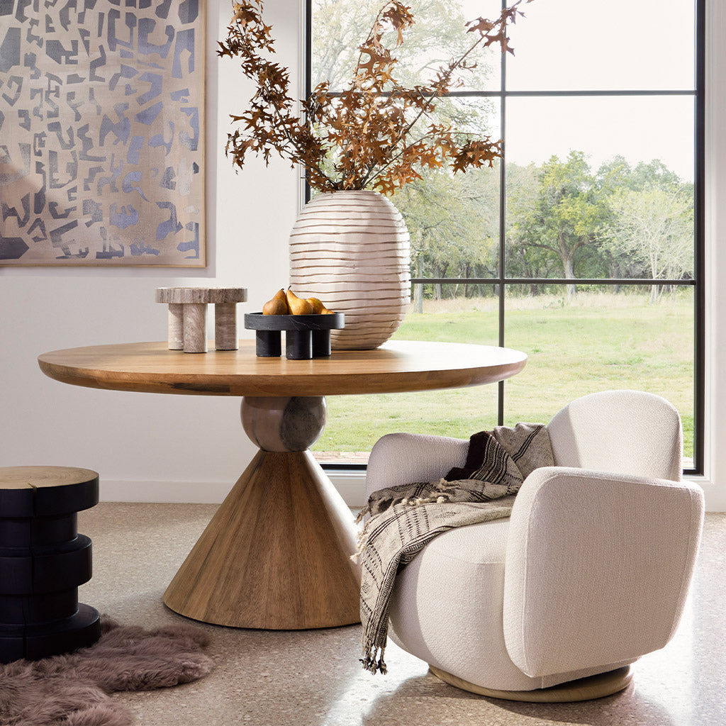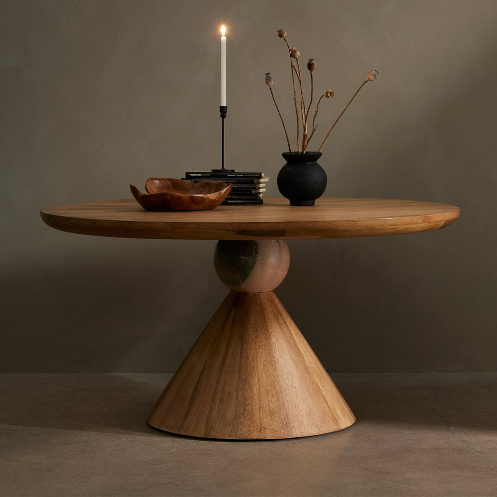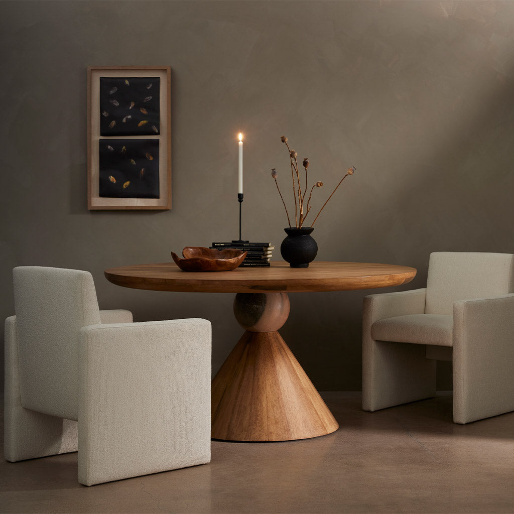A sculptural showstopper inspired by Italian design. Finished in a smoked honey, a cone-tapered parawood base supports a roomy, rounded tabletop separated by blush-finished marble detailing. Seats four to six comfortably.