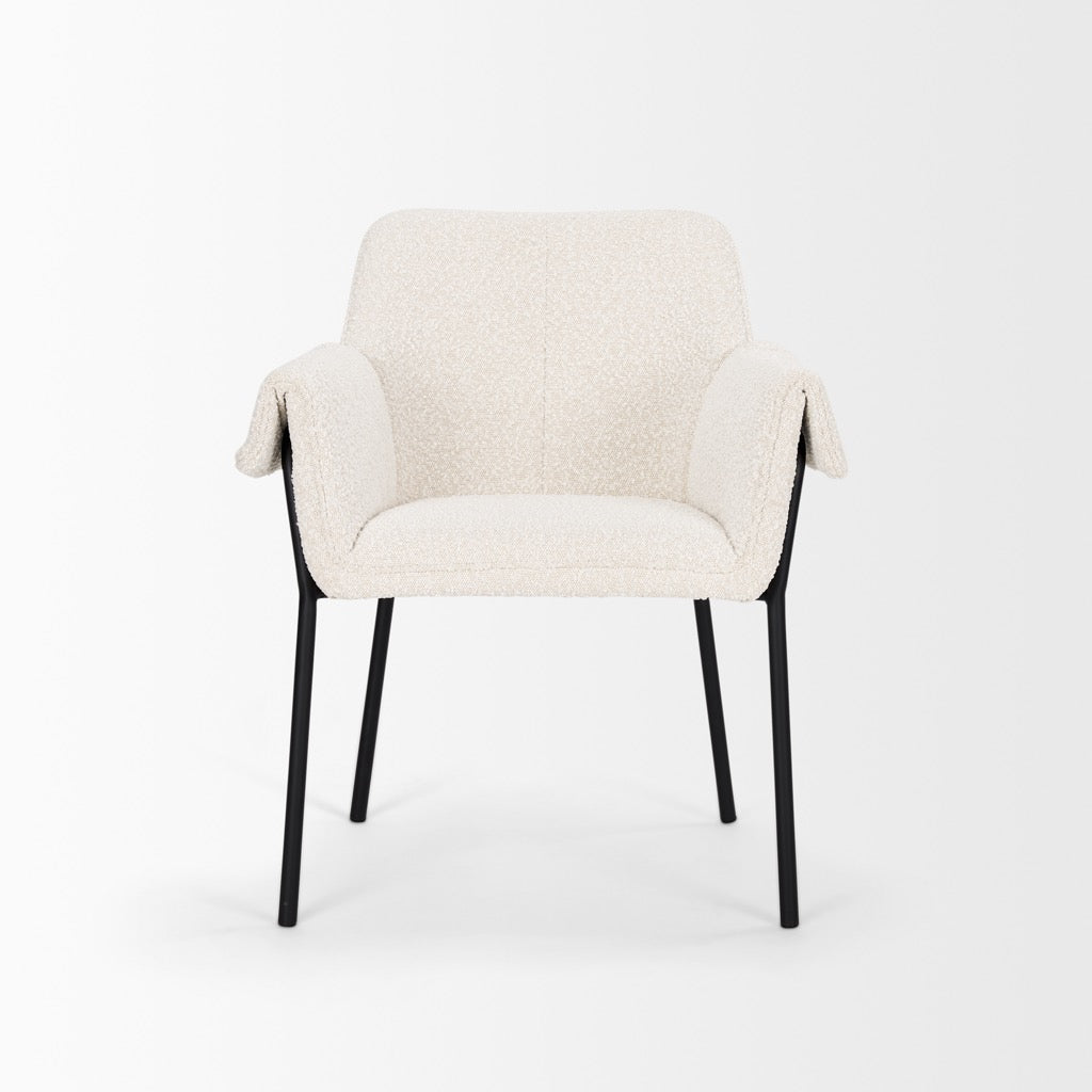 The Brently Dining Chair is upholstered in a nubby cream boucle fabric set within a matte black metal frame.