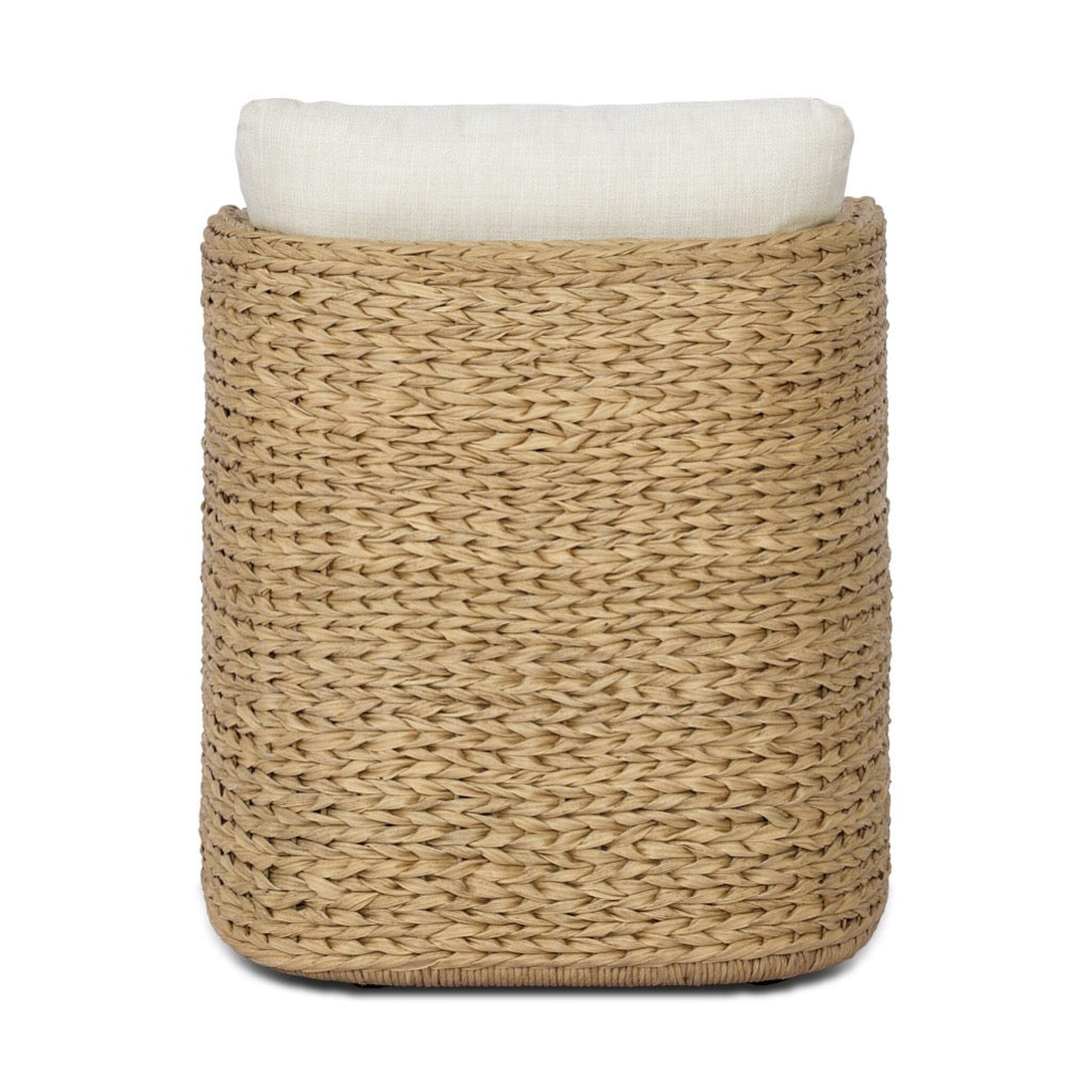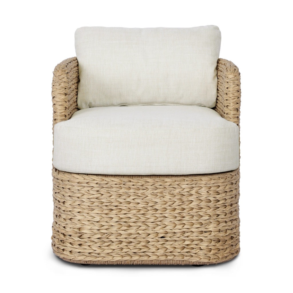 A classic barrel back silhouette meets coastal inspiration with a chunky woven texture. Neutral upholstery and simple shaping make this outdoor dining chair fit in a number of spaces. Casters offer easy flexibility. Cover or store indoors during inclement weather and when not in use.