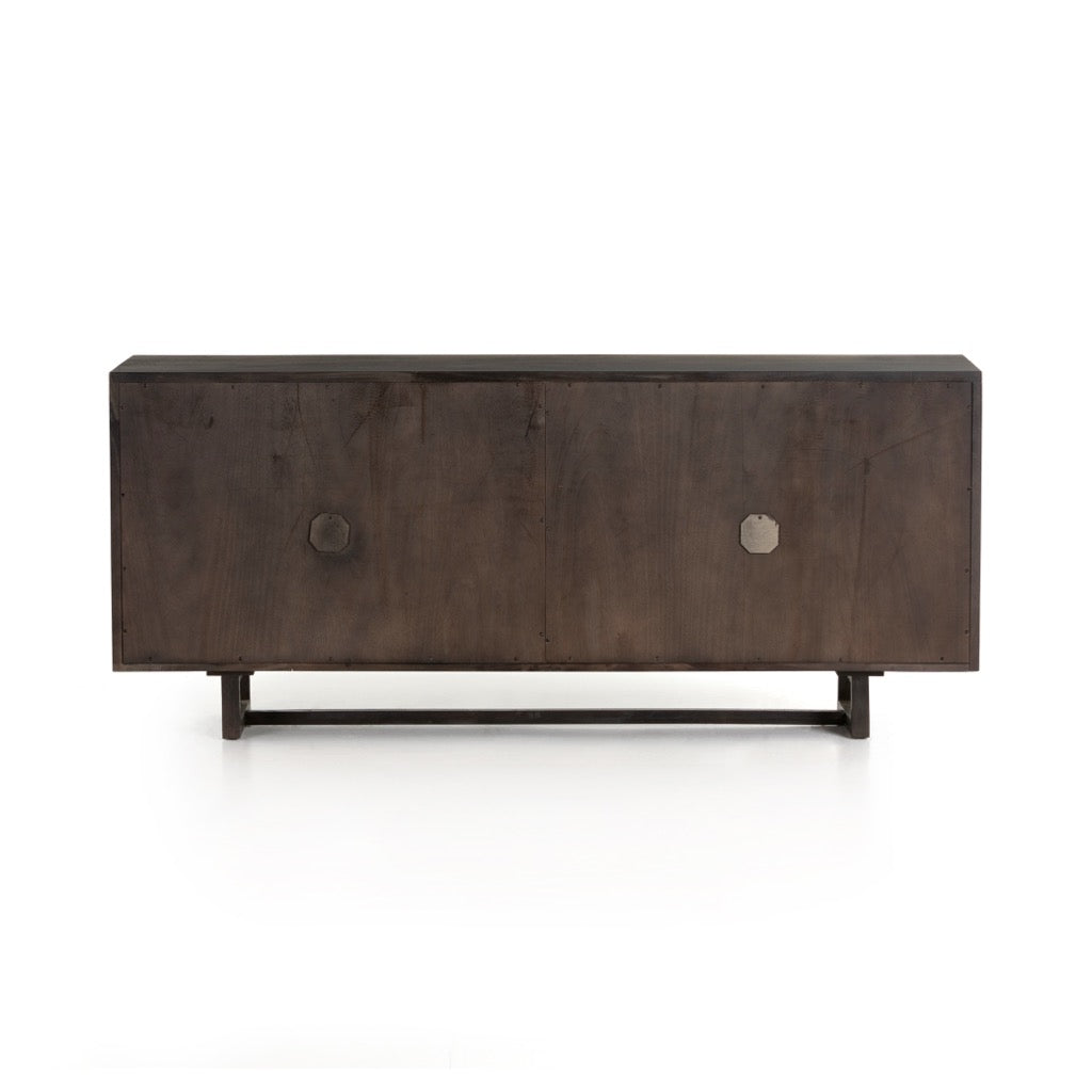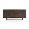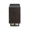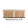 Mid century-spirited while beautifully on trend. A texture-driven sideboard of black-washed mango features white mango door fronts with natural cane paneling. Spacious interior for plenty of storage space, with adjustable shelving plus rear cutouts for cord management.