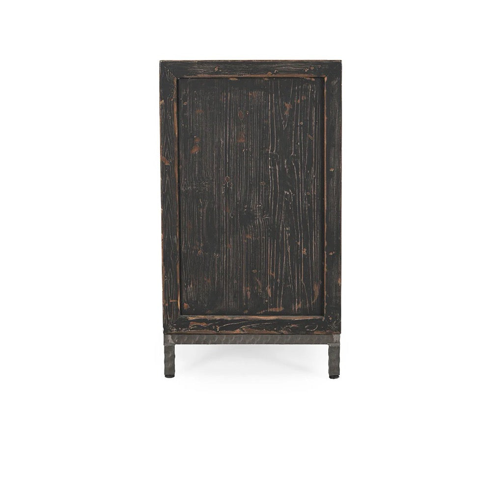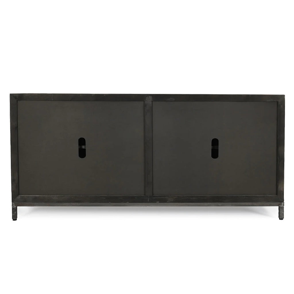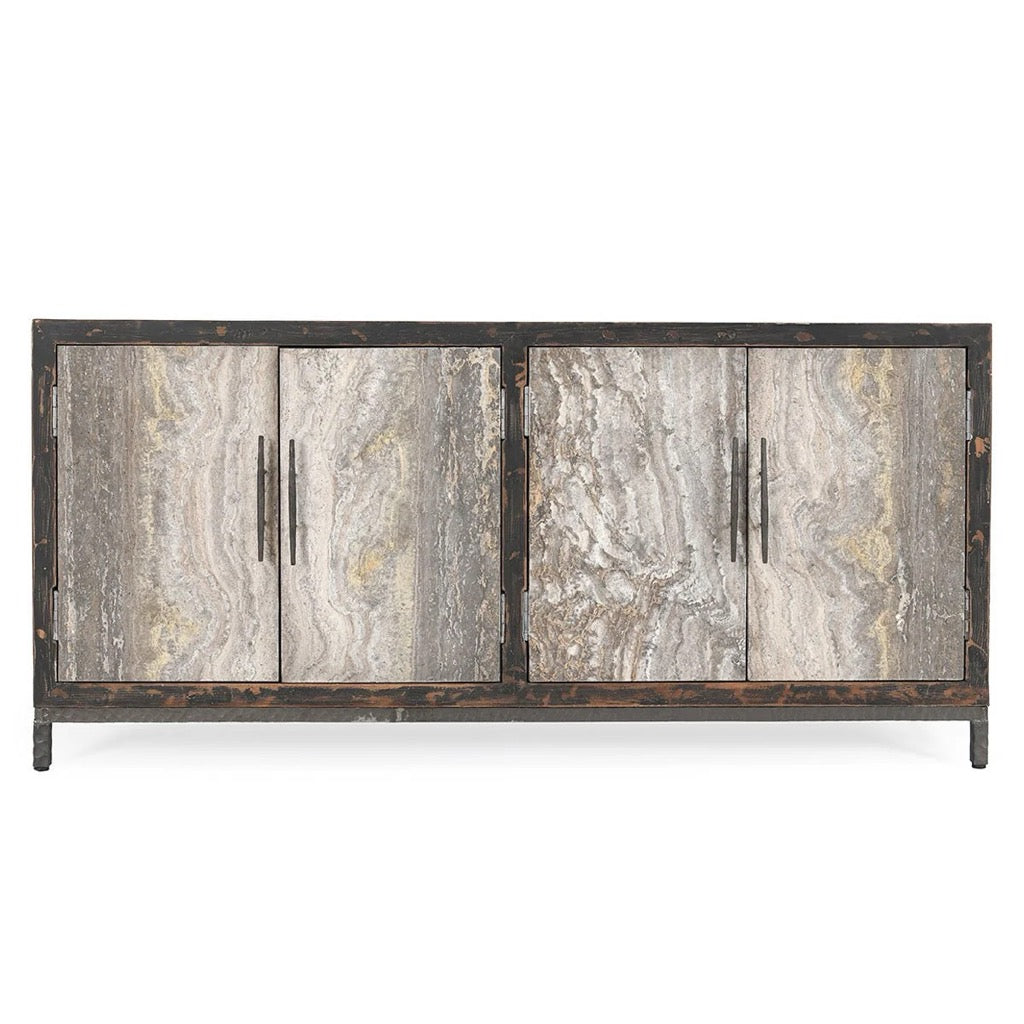 This rustic four-door sideboard offers both style and functionality, featuring a reclaimed distressed pine frame and travertine stone doors for a unique, earthy look. Enhanced with durable metal hardware, it provides ample storage with an adjustable and removable shelf for flexible organization. Three media cutouts at the back make it ideal for entertainment areas, and its rustic-modern design effortlessly complements living rooms, dining rooms, or entryways with a warm, timeless appeal.