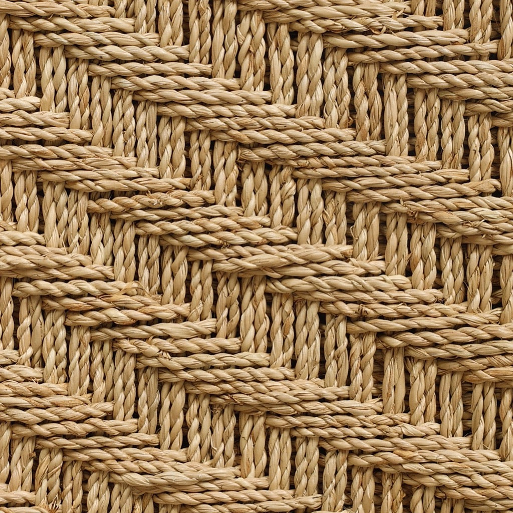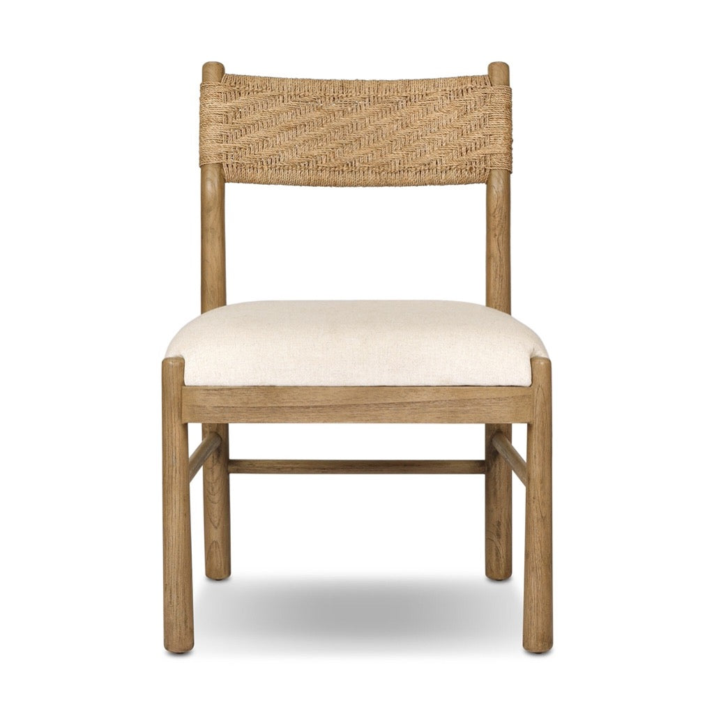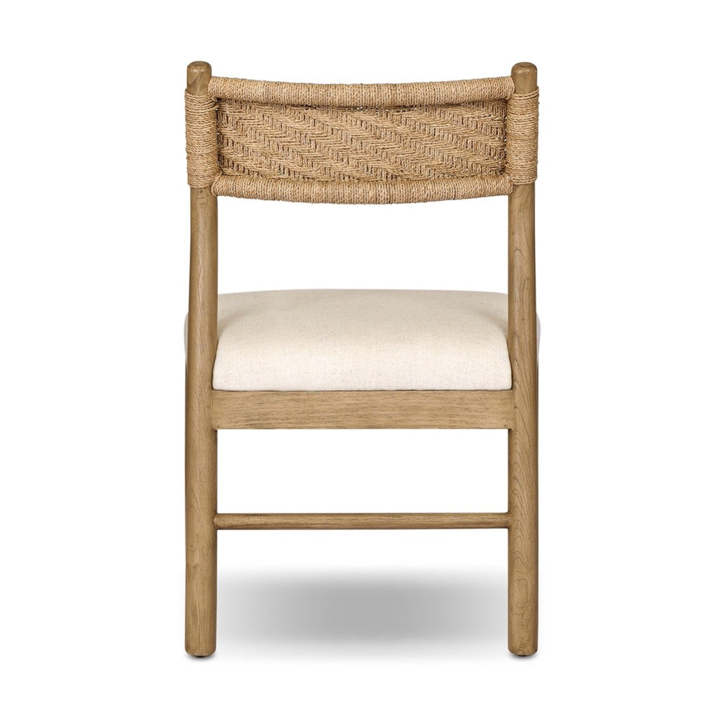 Generous proportions meet delicate detailing. Natural Agel palm fibers are woven to create a slatted look. Crafted from solid mindi wood with tapered cylinder legs and a flax/linen upholstered seat.