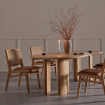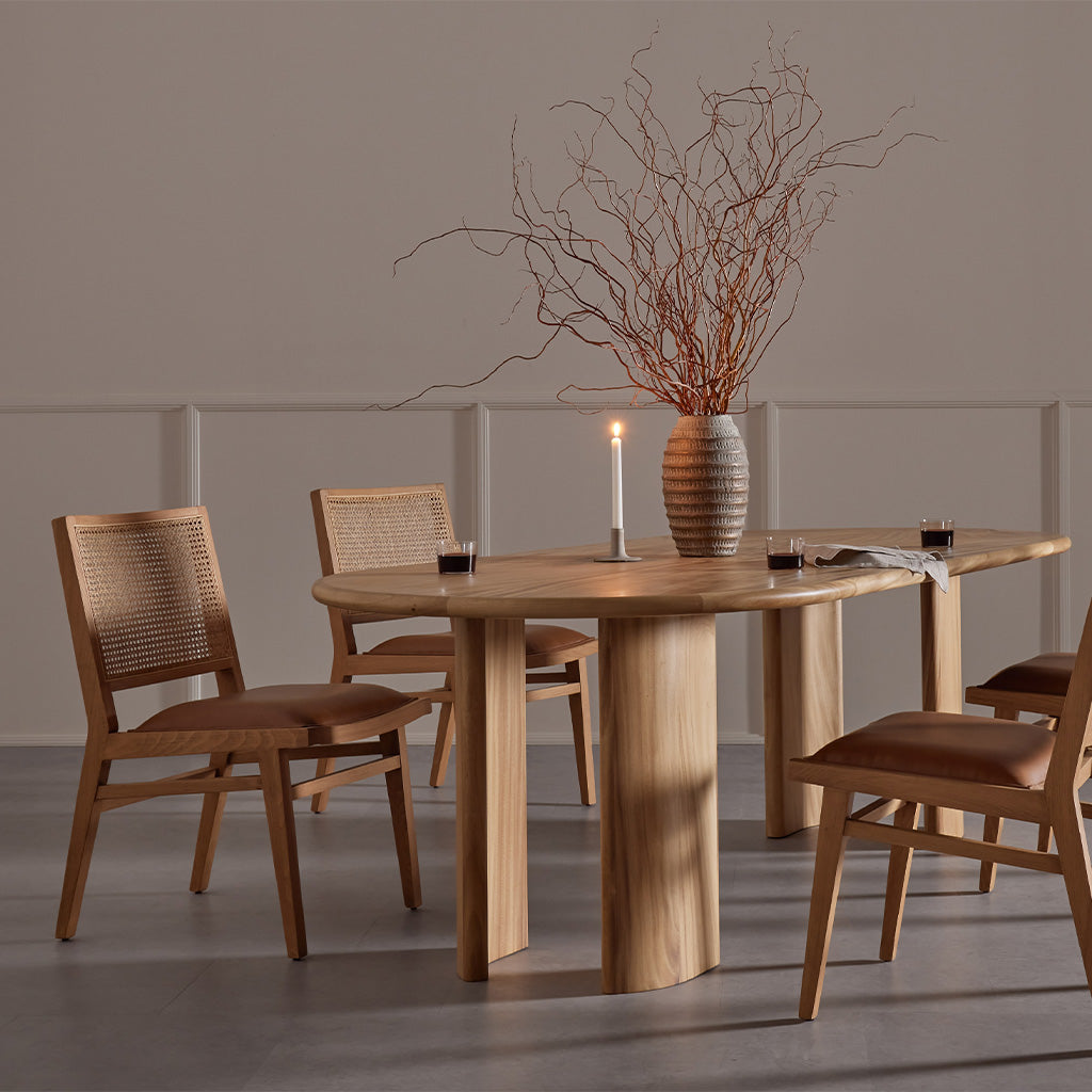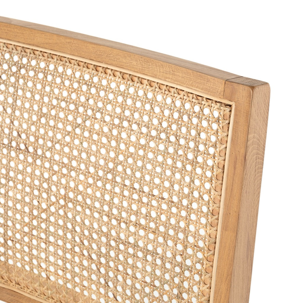 Mixed materials make the chair. Solid, sand-colored beech wood features a natural cane back for extra texture, while a butterscotch-finished faux leather seat serves total comfort.