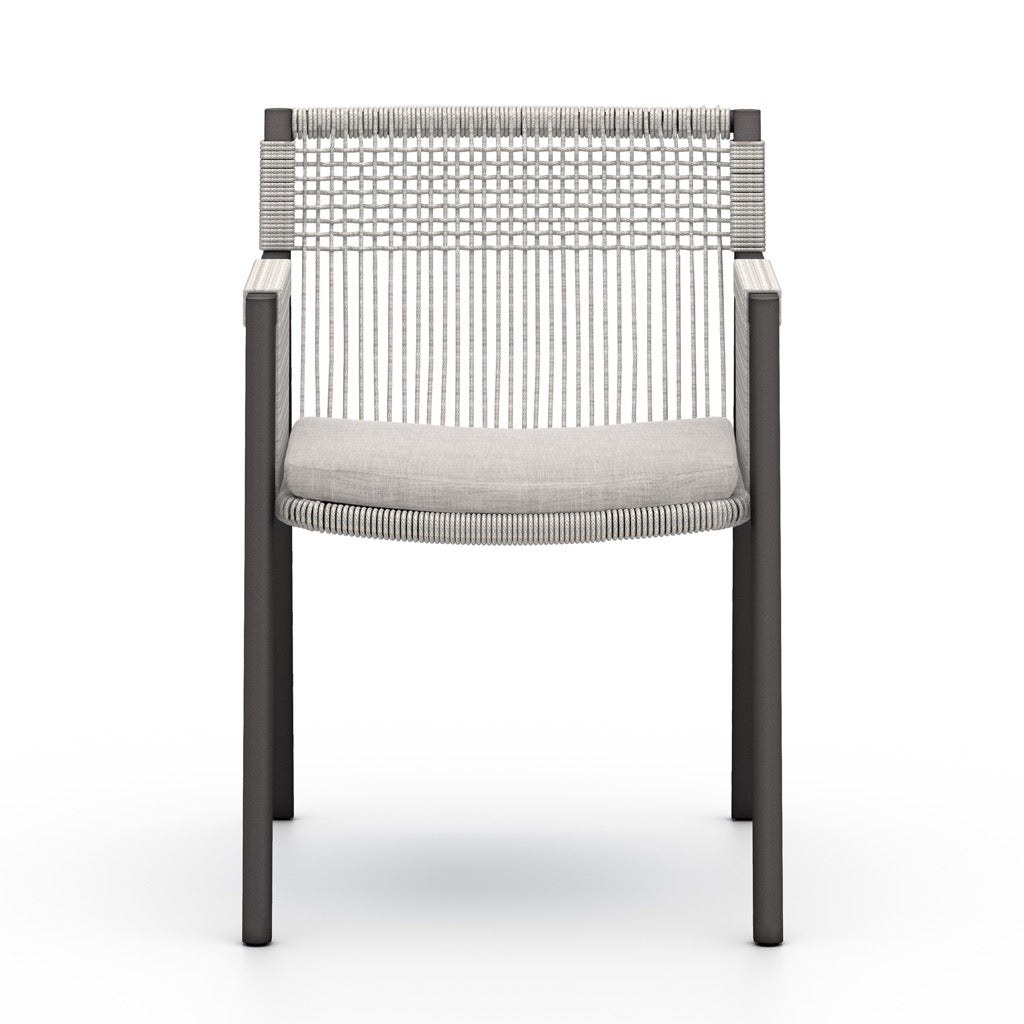 Eyecatching from every angle. Heathered rope is woven at varying widths along the back, sides and arms of this outdoor dining chair for linear detailing all around. Outdoor-friendly aluminum frame with removable seat cushion covered in UV-resistant, water-repellent fabric. Cover or store inside during inclement weather and when not in use.