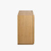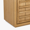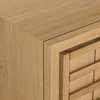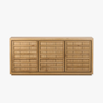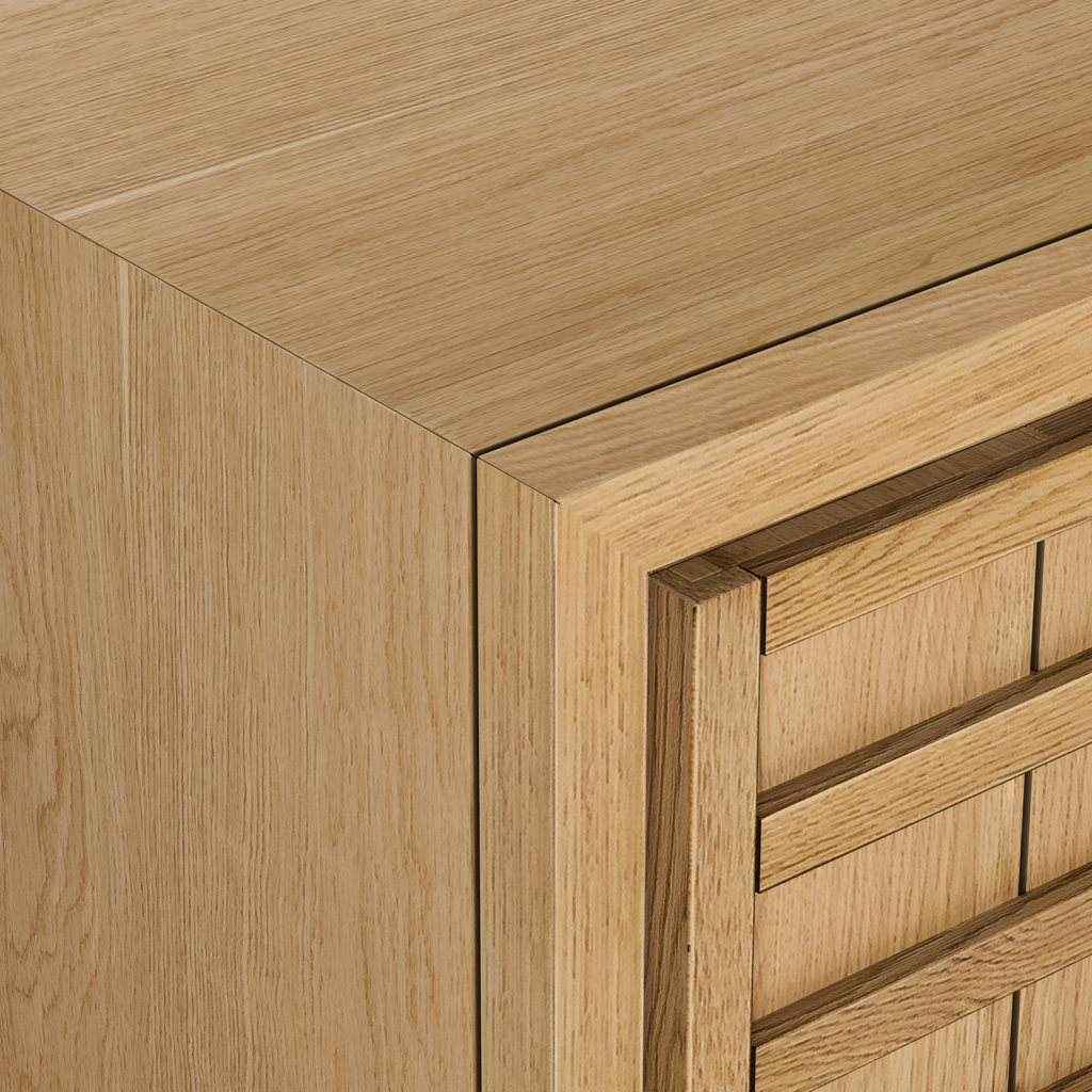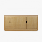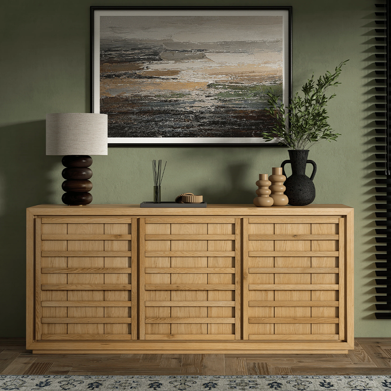 The Buddy Oak Buffet combines the beauty of natural oak wood with a textured finish achieved through a wirebrushing technique that showcases the depth and character of the wood grain. Ample storage is provided by adjustable shelving behind doors featuring push latch hardware. The door fronts are inspired by English-style windowpanes.