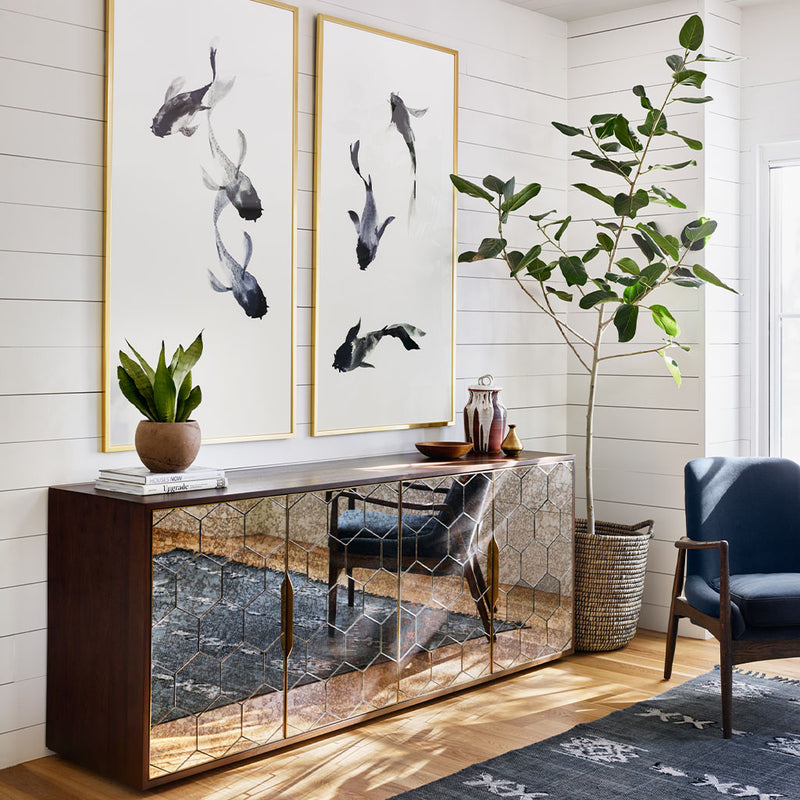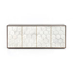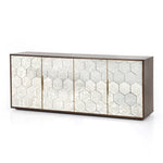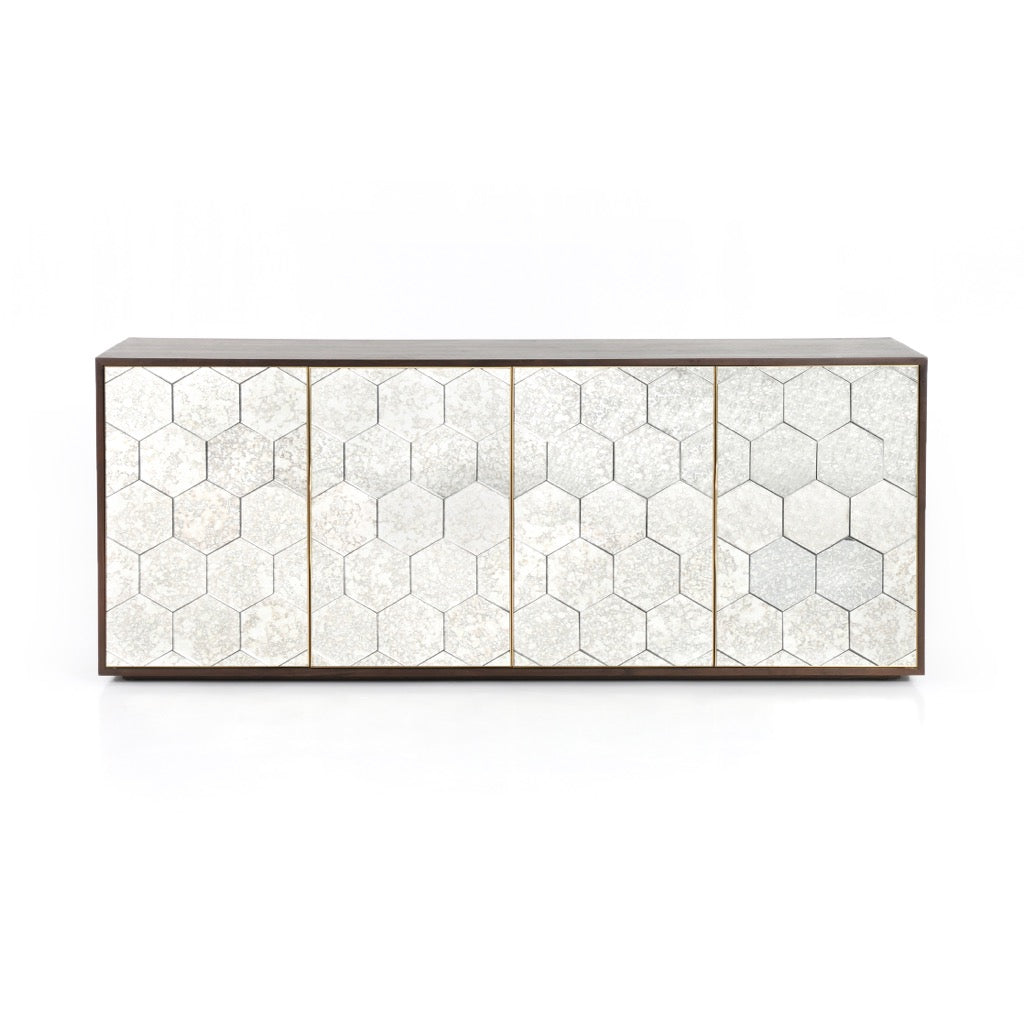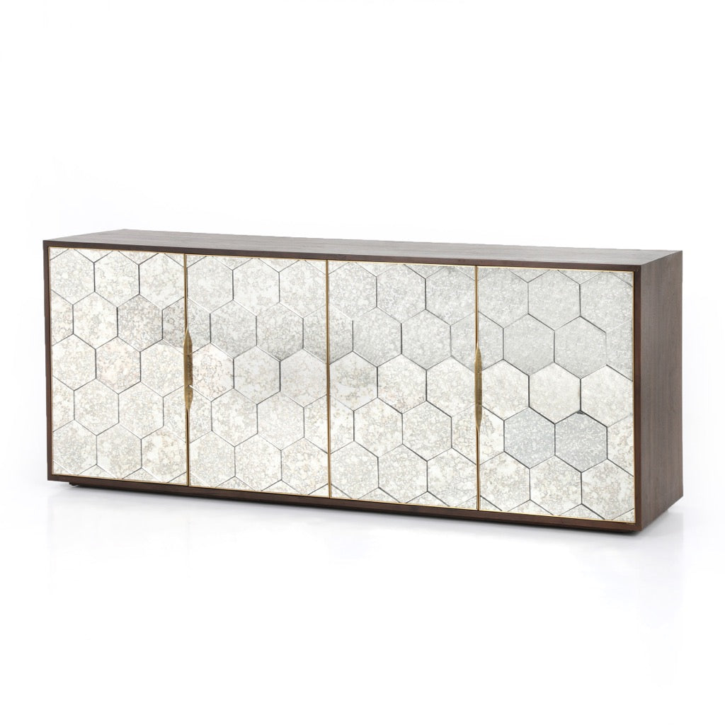 Ornate detailing places a trend-forward spin on streamlined shaping. Dark walnut encases glass doors of antique mirror with a honeycomb pattern, adding artistic intrigue to statement storage. Stainless steel hardware is finished in polished brass for a look of effortless sophistication.
