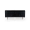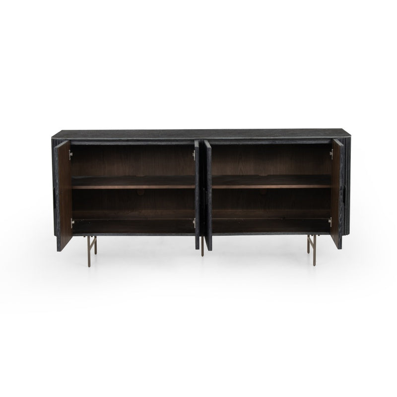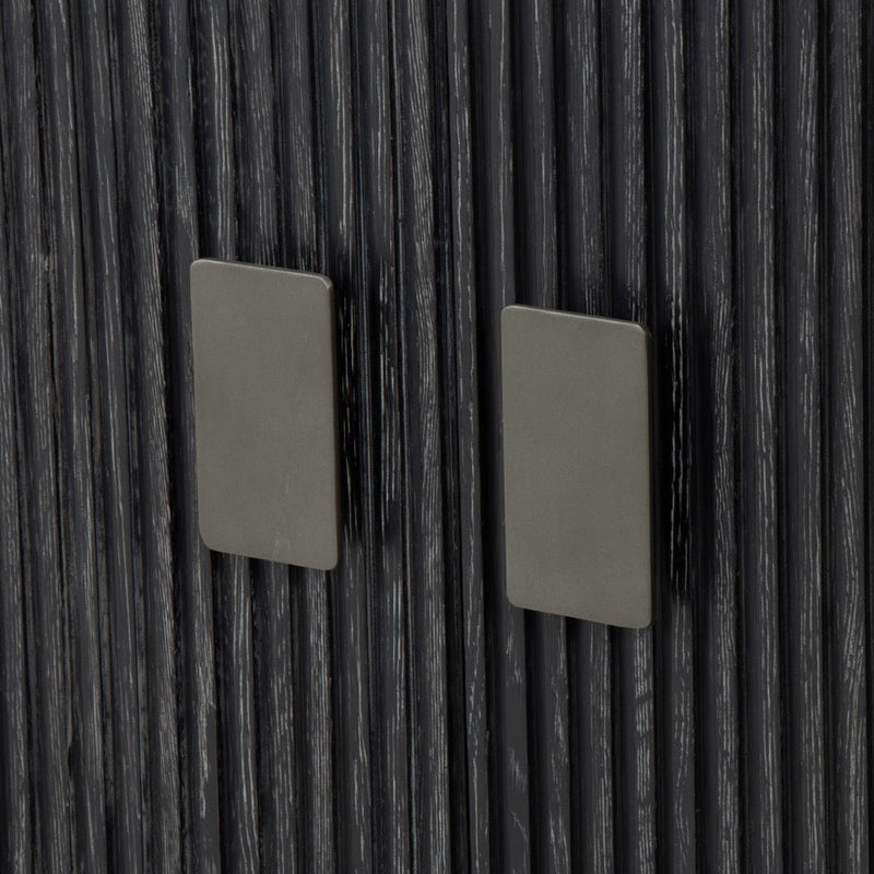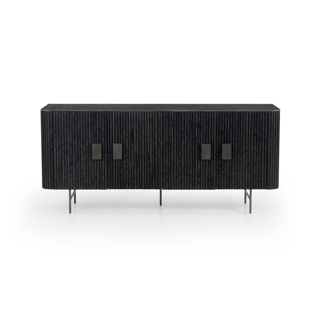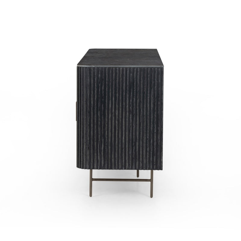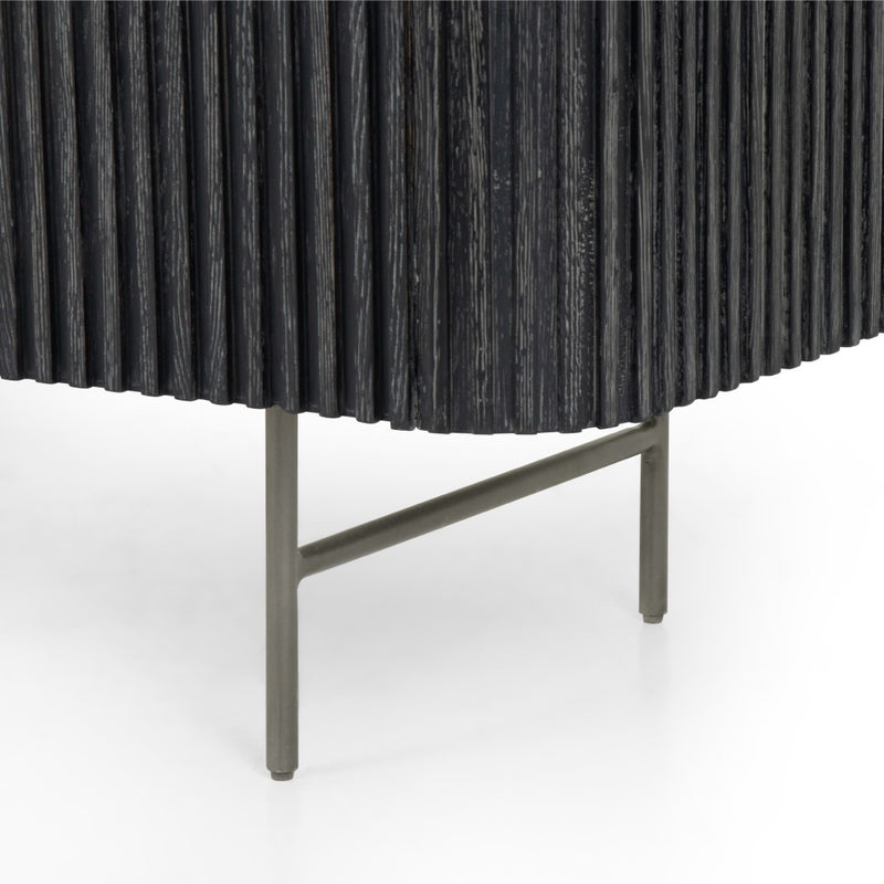 A clean mid-century form, modernized by mixed materials. Black oak casing is whitewashed for a ceruse-like look, with vertical reeding for rich texture. A smooth bluestone top adds a sophisticated element of surprise, while oversize iron hardware hints fresh edge. Posterior cutouts for cord management.