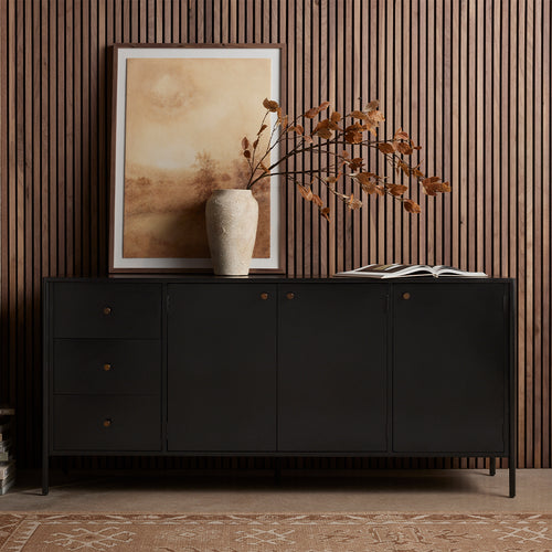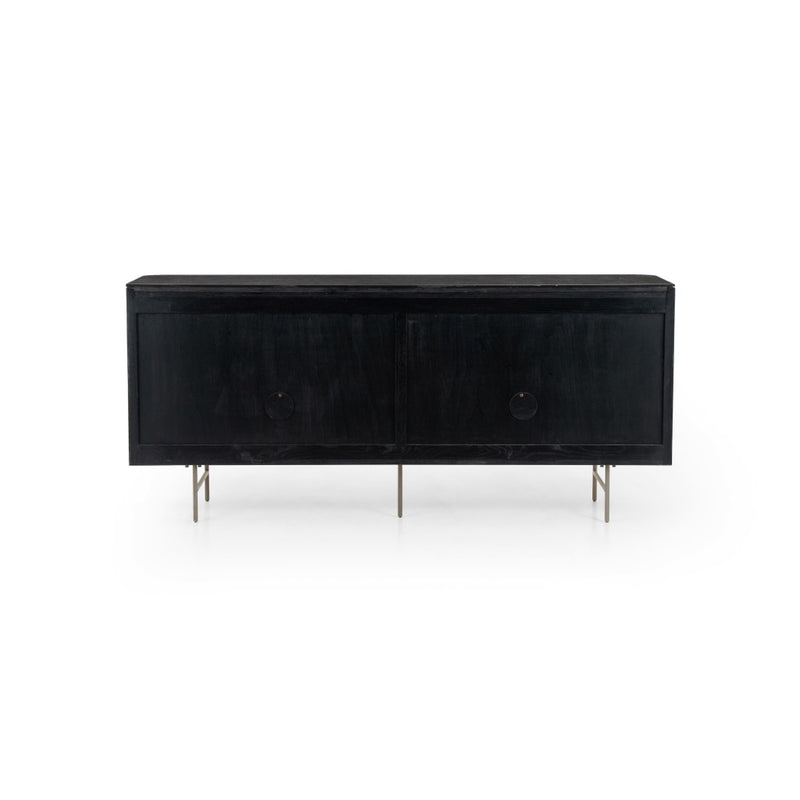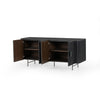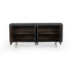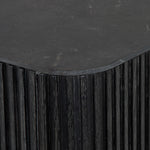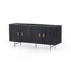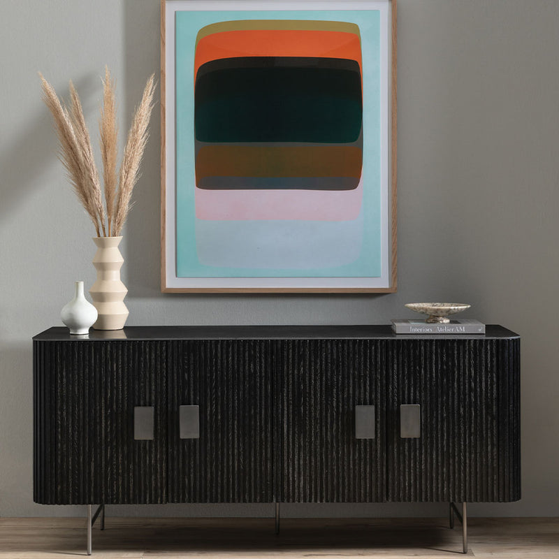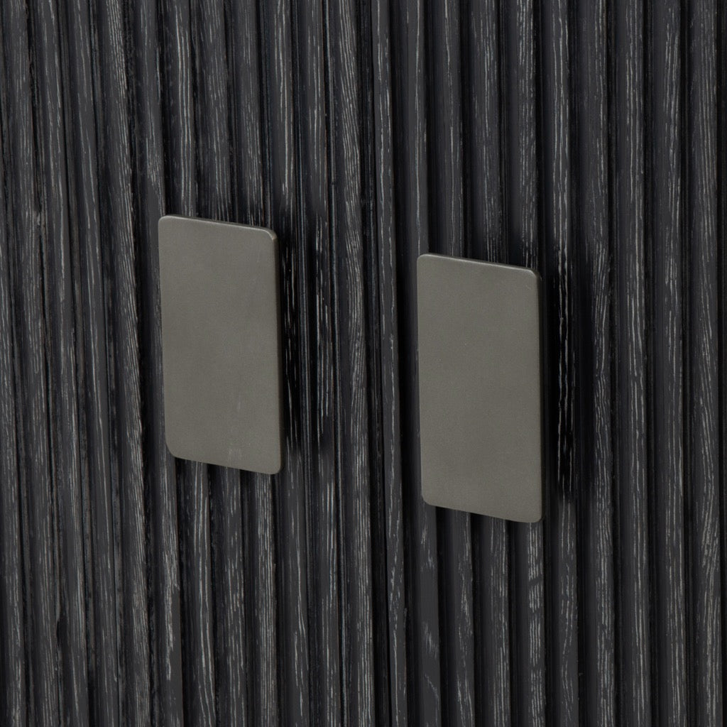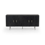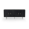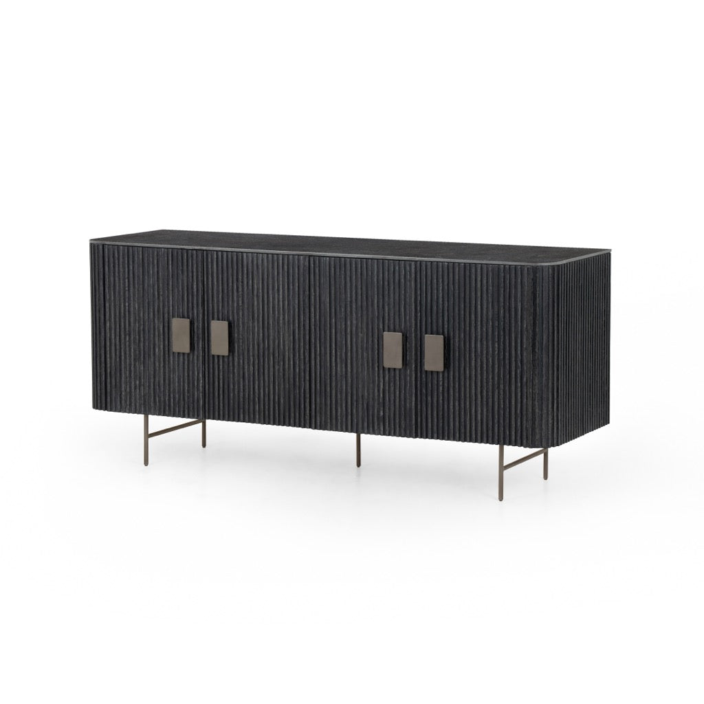 A clean mid-century form, modernized by mixed materials. Black oak casing is whitewashed for a ceruse-like look, with vertical reeding for rich texture. A smooth bluestone top adds a sophisticated element of surprise, while oversize iron hardware hints fresh edge. Posterior cutouts for cord management.