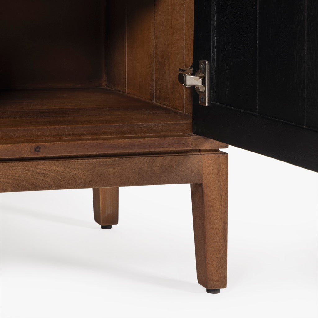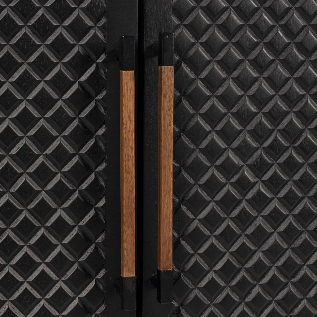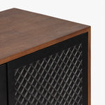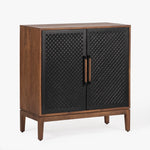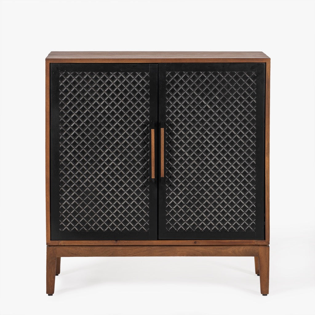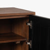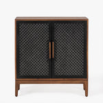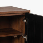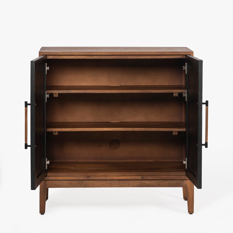 The Naya Cabinet combines modern elegance with practical storage. Featuring a black and walnut finish, this cabinet stands out with its black metal hardware and wood detailing. With two doors and spacious shelving, it's perfect for organizing while adding a refined touch to any space.