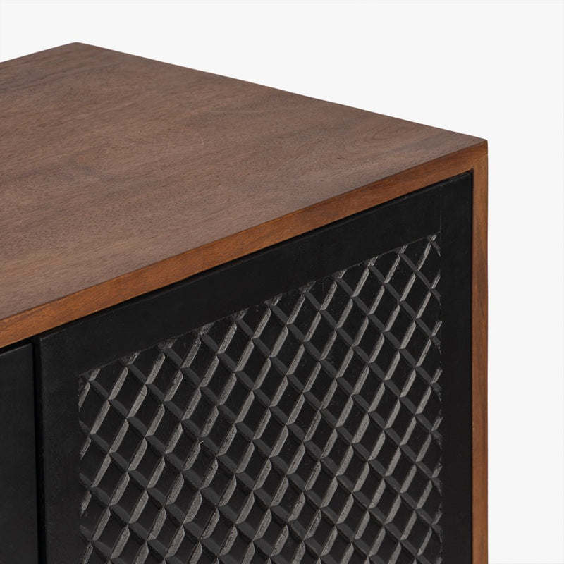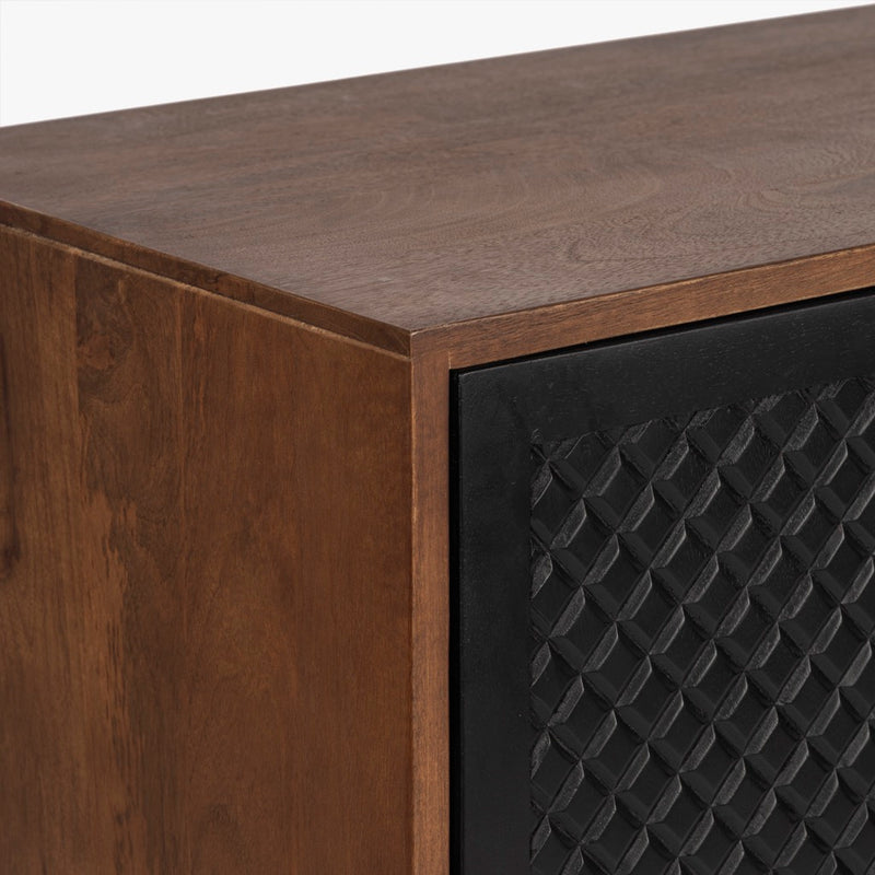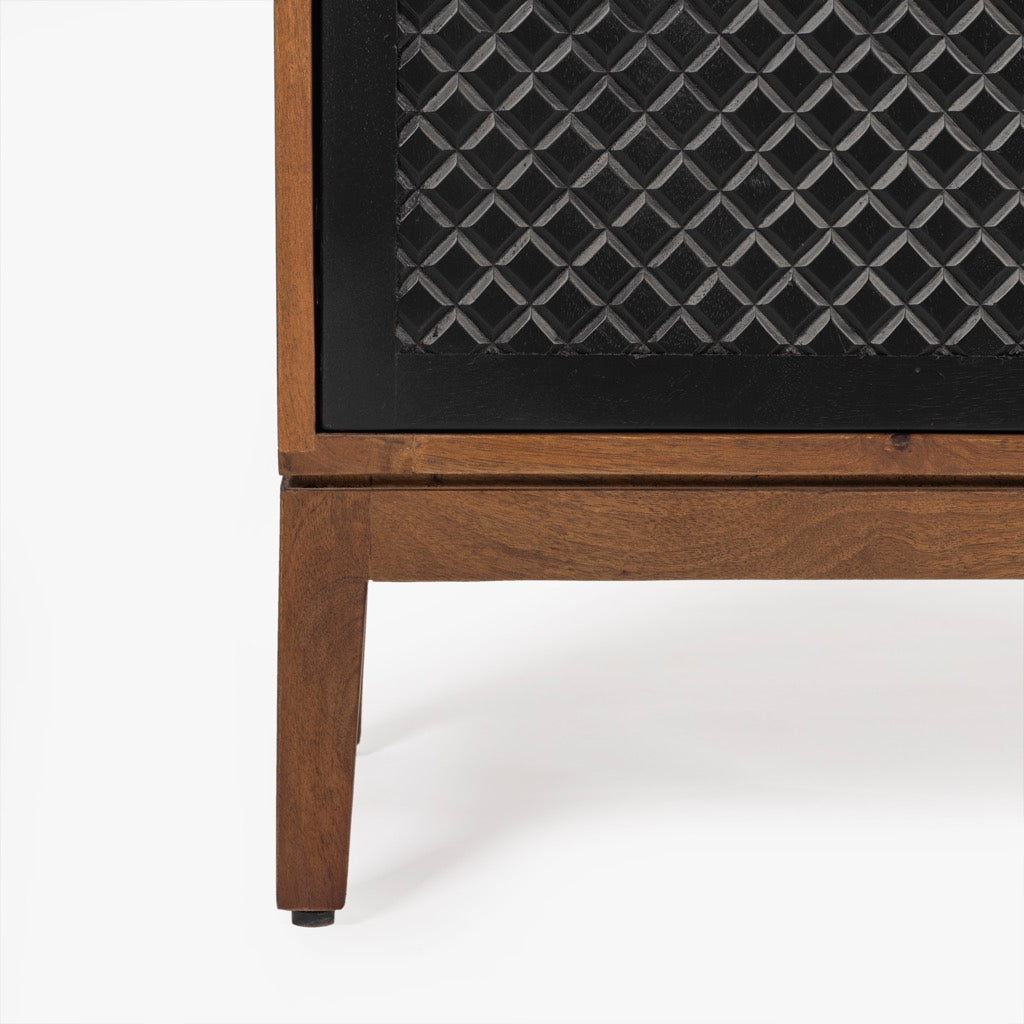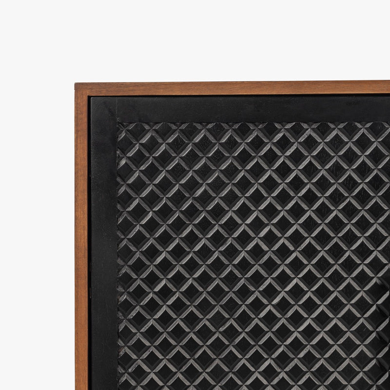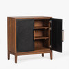 The Naya Cabinet combines modern elegance with practical storage. Featuring a black and walnut finish, this cabinet stands out with its black metal hardware and wood detailing. With two doors and spacious shelving, it's perfect for organizing while adding a refined touch to any space.