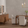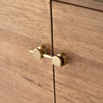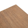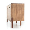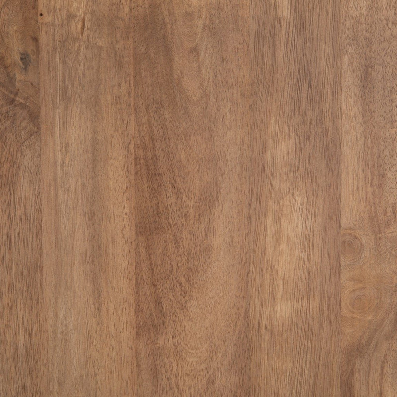 Mid-century styling with a Shaker spirit. Finished in a light, smoked honey, a clean-lined parawood console sits in an arched cradle base of toasted acacia, for fresh contrast. Twist-lock metal hardware adds a clever finishing touch. Rear cutouts for cord management.
