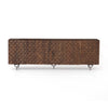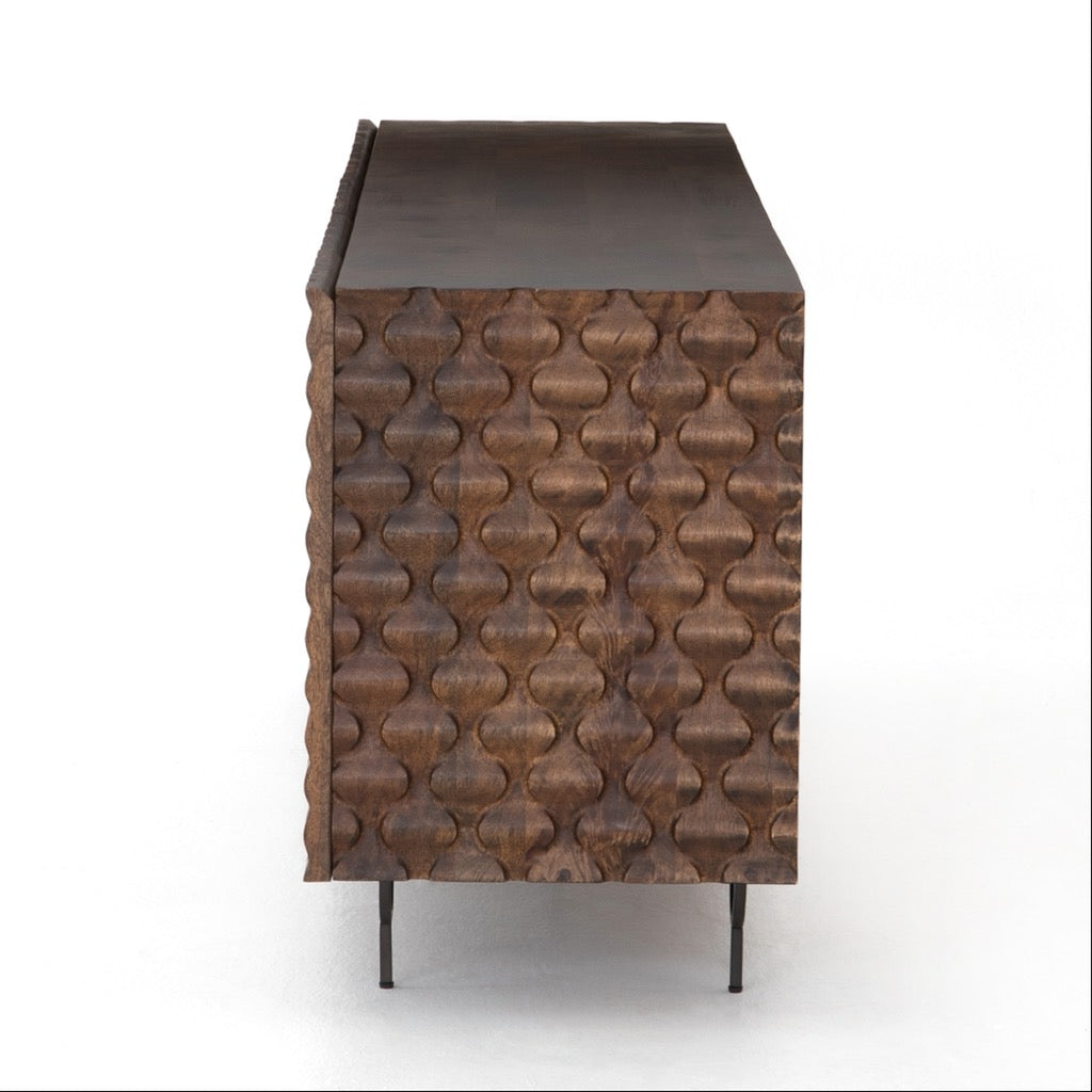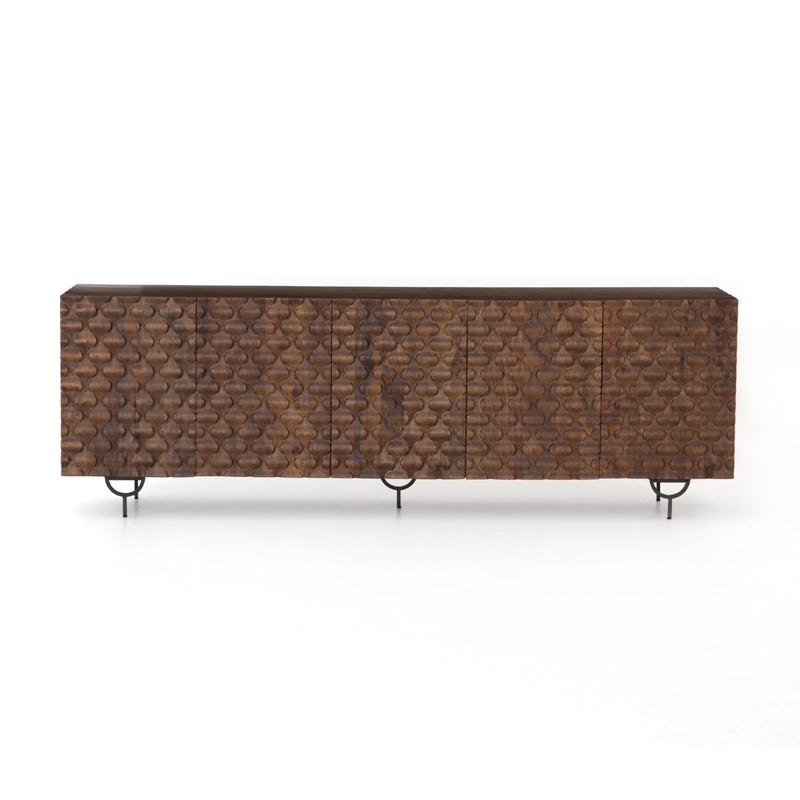 Long and low-styled. Antique brown mango wood adopts intricate CNC carving for a uniquely textured look. Rounded iron legs offer an intriguing material mix with a modern touch. Interior shelving for media storage and rear cutout for cord management.