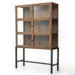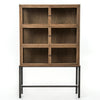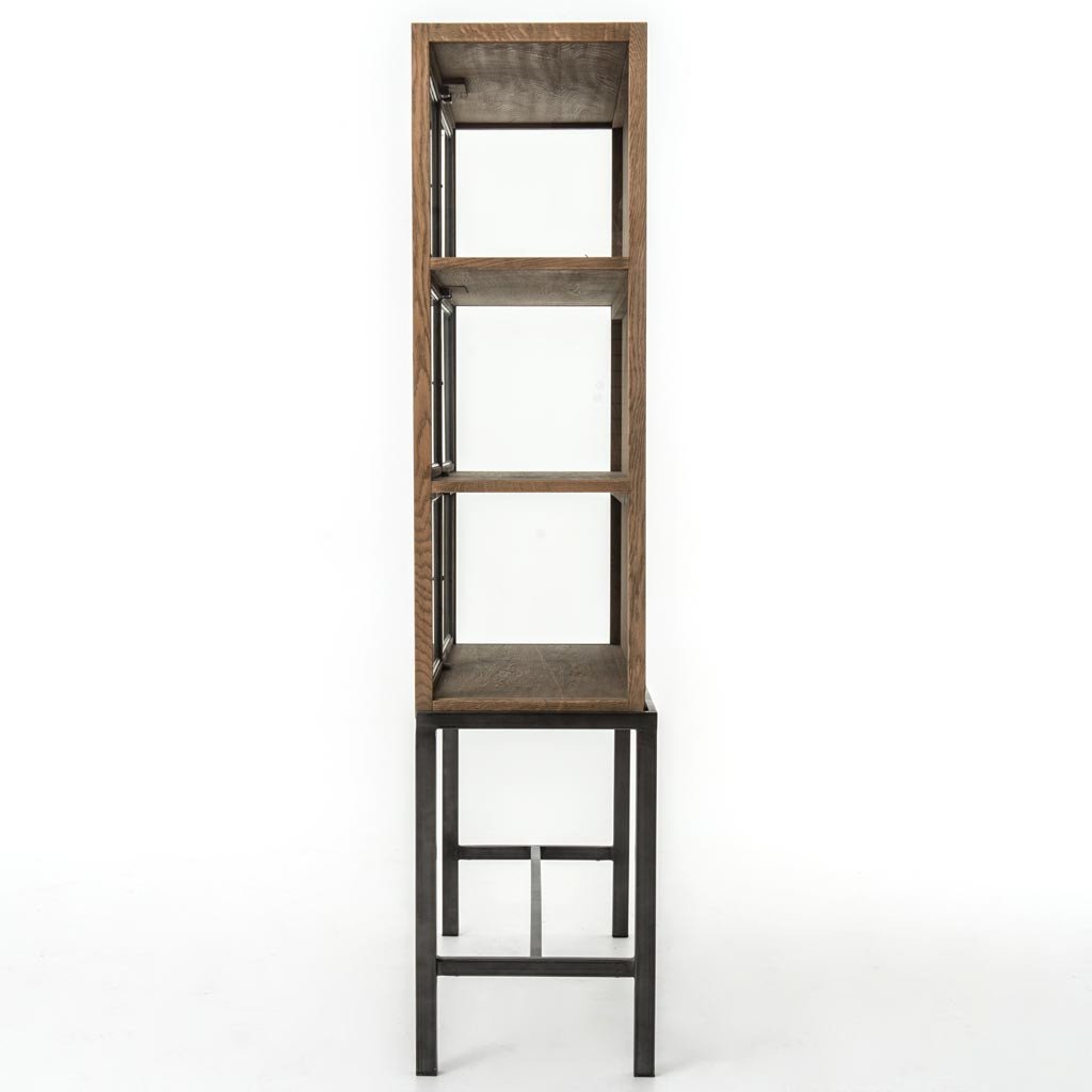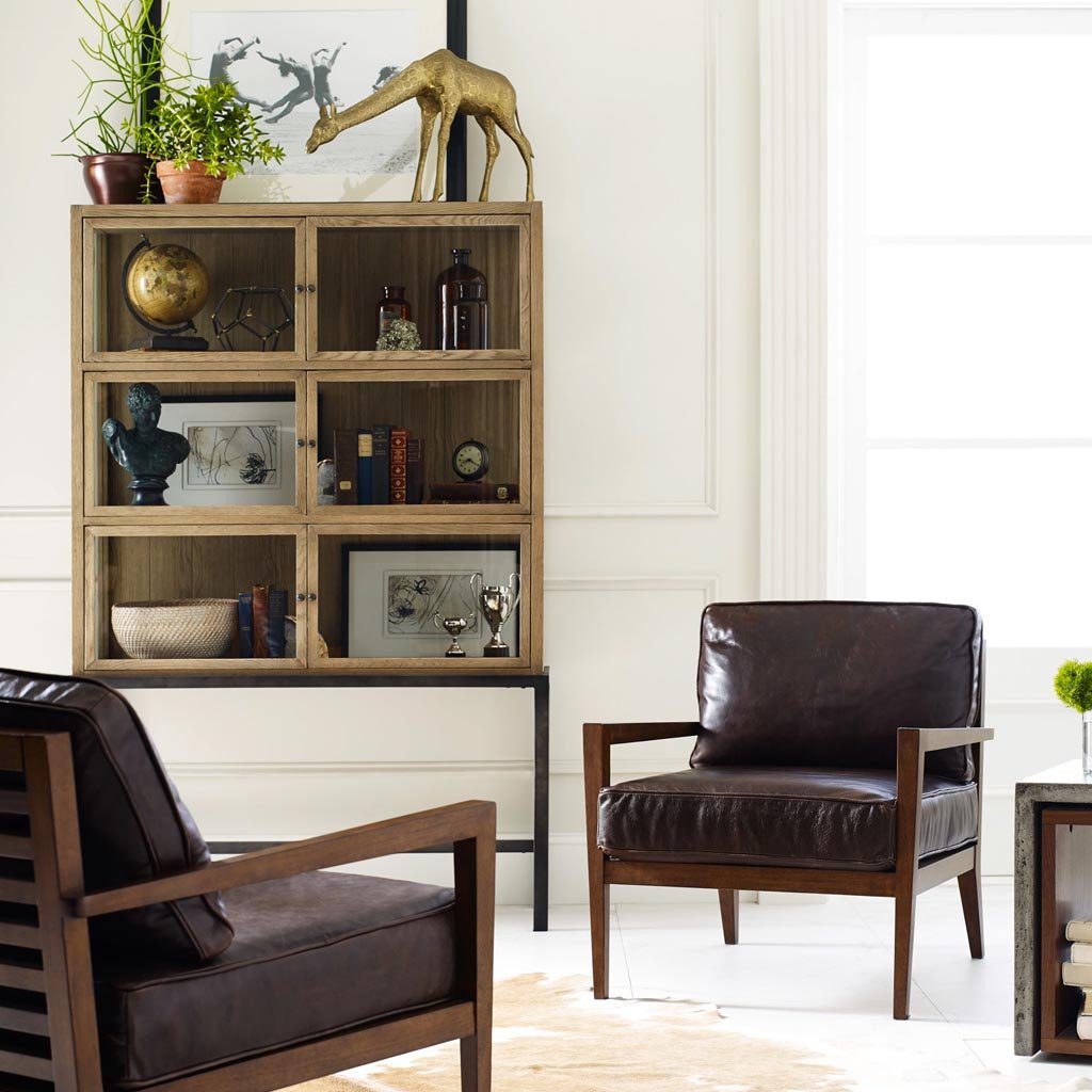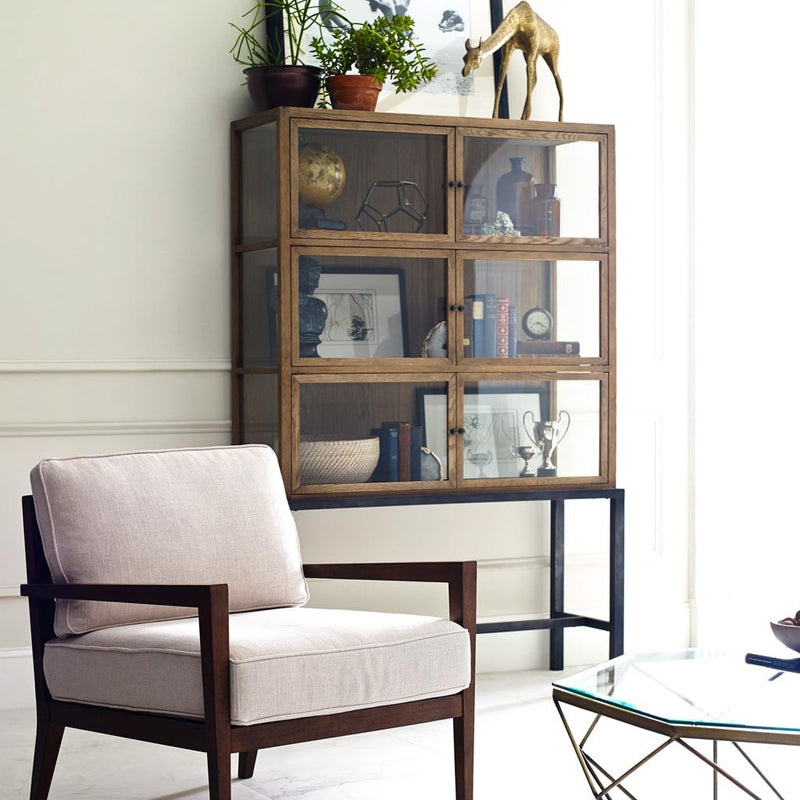 See and be seen. Drifted oak forms an airy curio cabinet designed to highlight life’s artifacts. Perched on a simple, waxed black iron pedestal.
