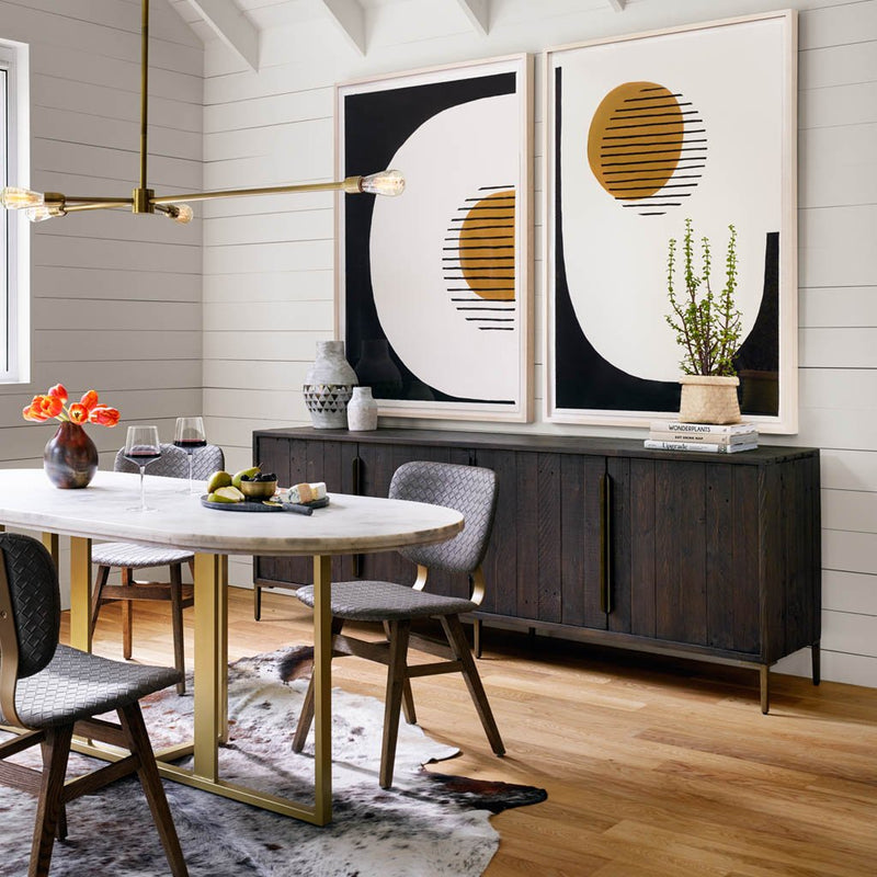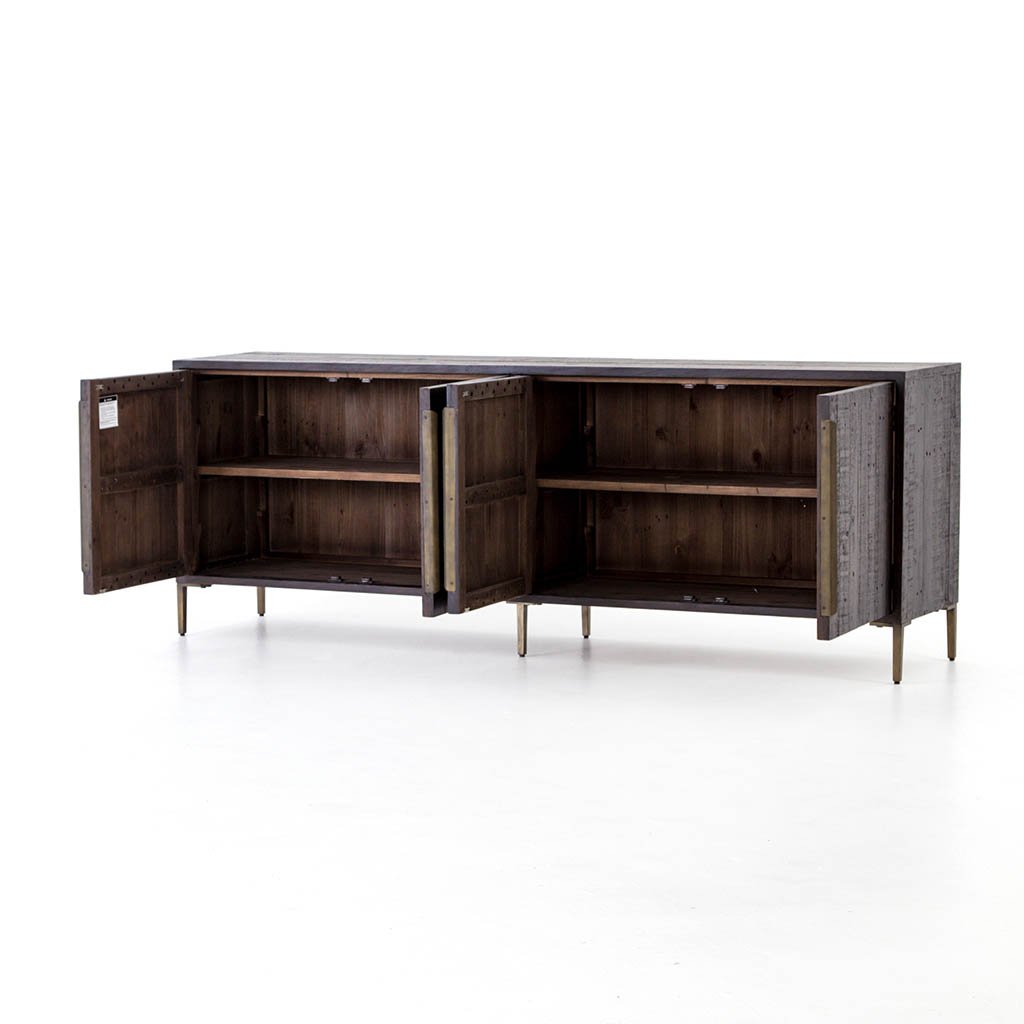Alluring angles and streamlined accents bring fresh edge to rich, reclaimed woods. Inspired by contemporary European design, the Wyeth sideboard has uniquely tapered legs and over-scaled hardware that merge to emit statement-like effect suitable for mixing and matching with an array of décor styles.