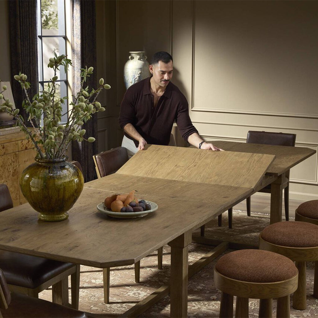 For dinners and buffets, large to small, this extension dining table serves the purpose. A low, trestle base of solid oak and veneers support the rectangular tabletop with a warm, drifted finish. On both ends, breadboard extensions provide the option to expand from 96" to 136".