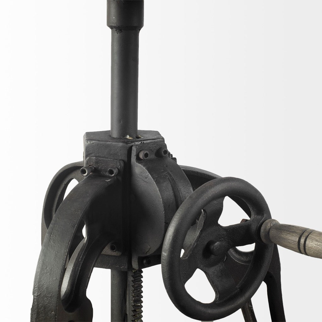 - Industrial Inspired Base: Featuring a round top braced by a three-legged, industrial-inspired iron base that is equipped with a crankshaft, the Emslie is truly unique in terms of design, blending unexpected materials and colors to elevate your space.