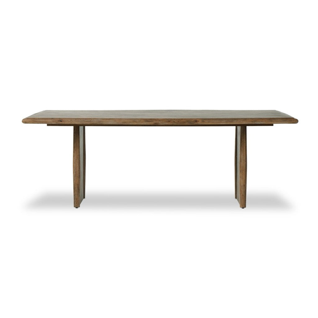 Made from weathered oak, simple lines and a light, rustic finish play up the natural beauty of this double pedestal dining table.