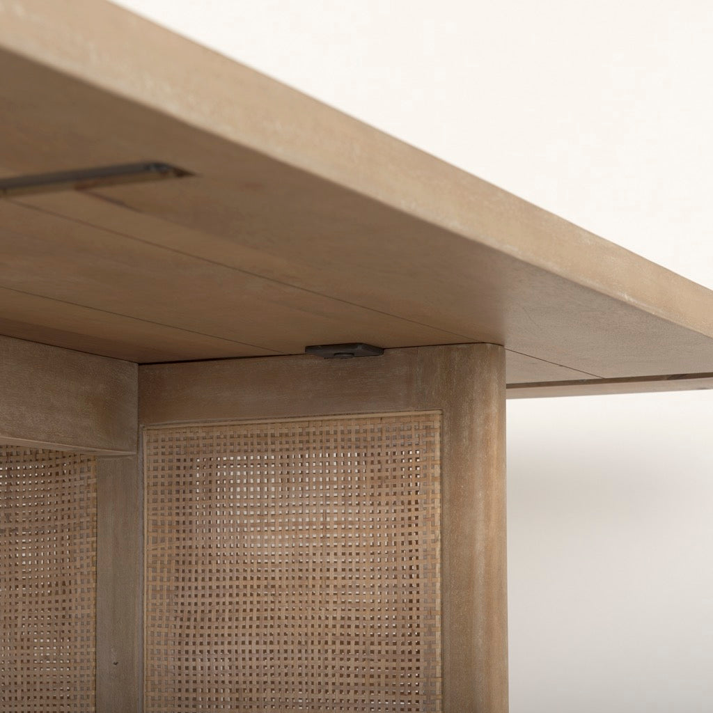 This Grier Dining Table is made of solid mango wood finished in light brown, with two beautiful cane panels that can be seen on each side of the table base.