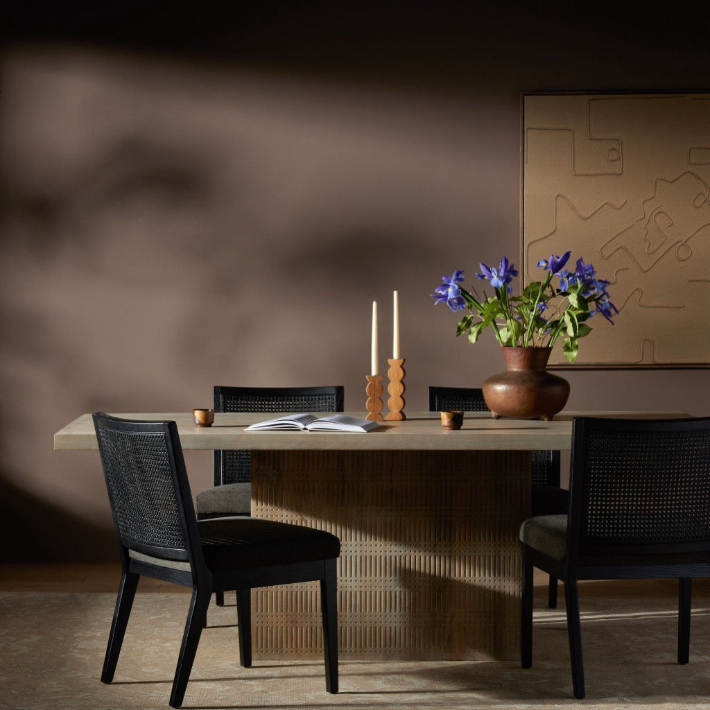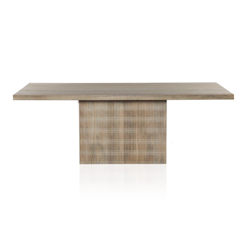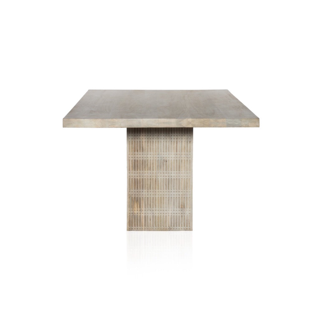 Unique linear carving with an artisan slant. Mango wood is finished in a light wash, highlighting texture and craftsmanship alike. Seats eight comfortably.