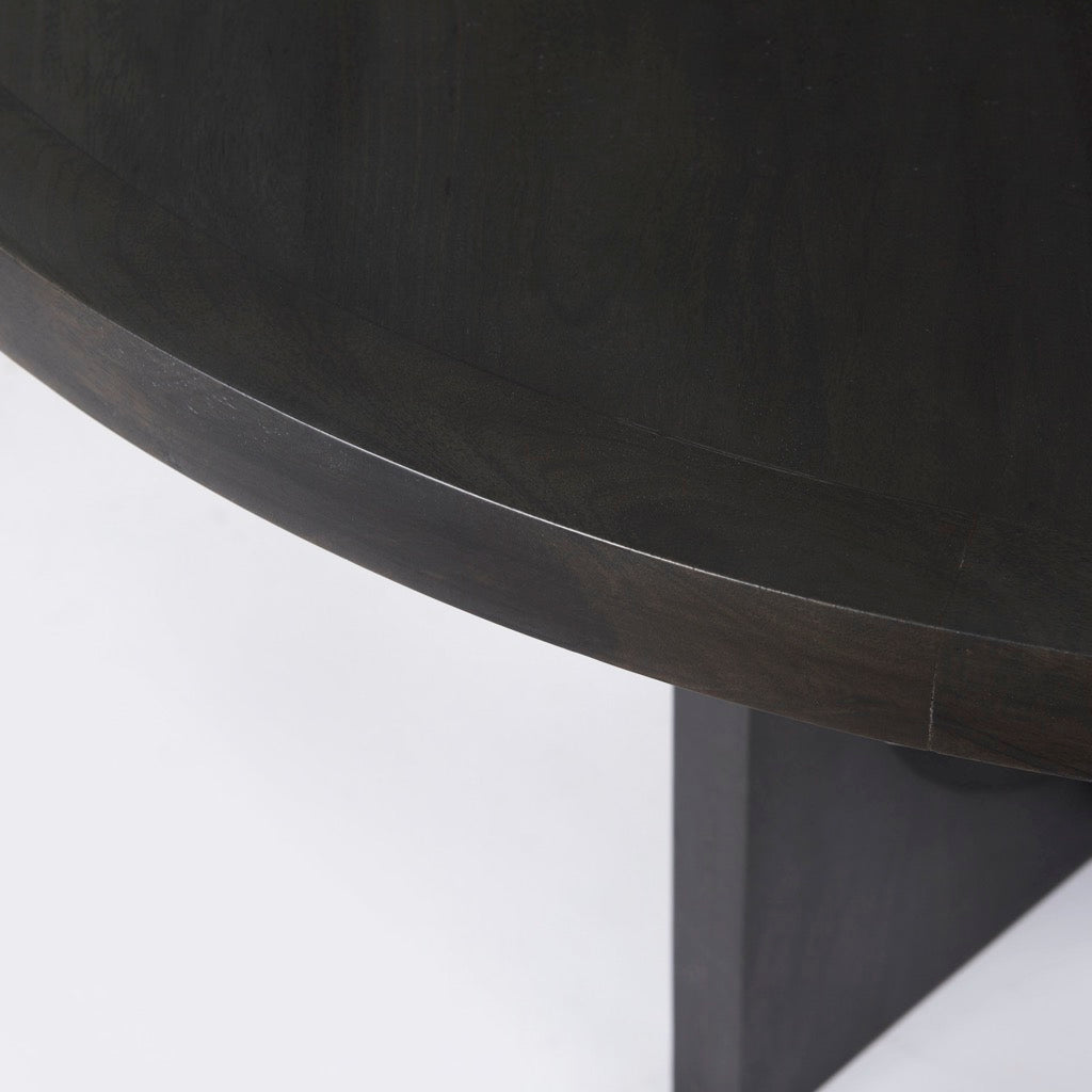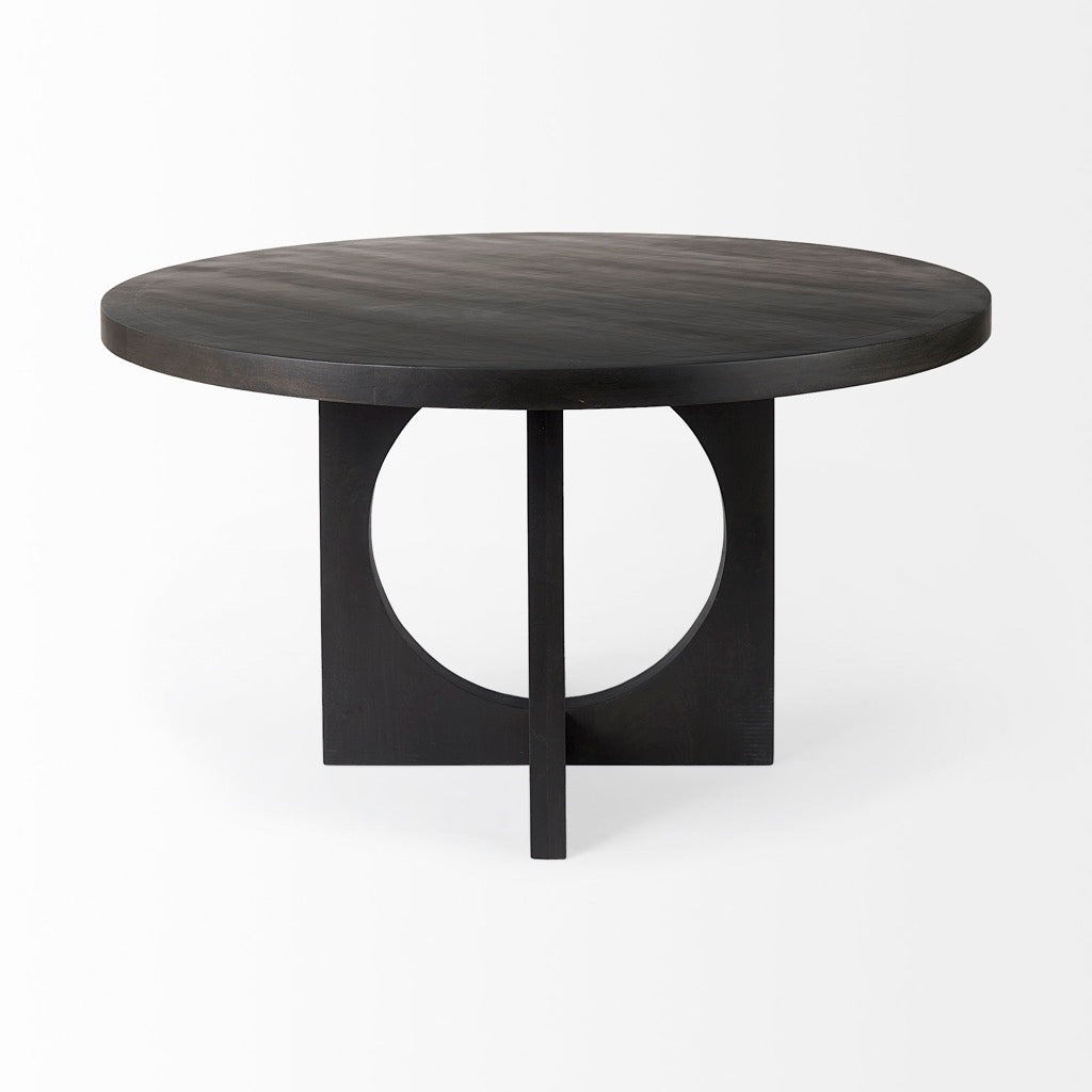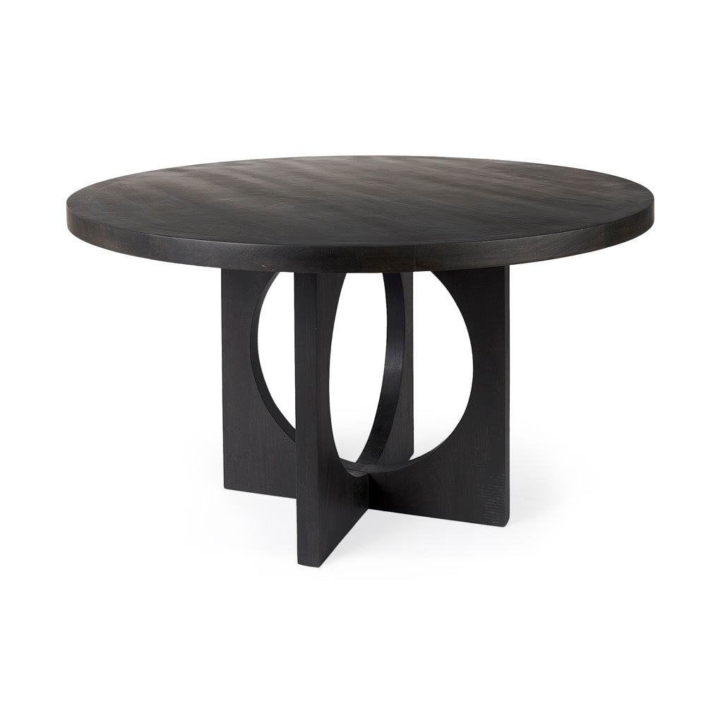 The Liesl is a round dark brown dining table made from solid Indian mango wood featuring a geometric base.