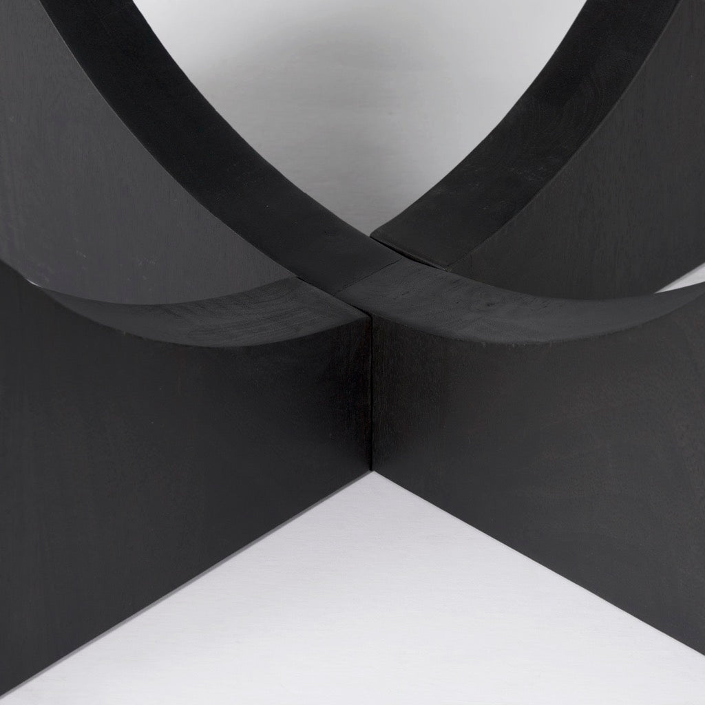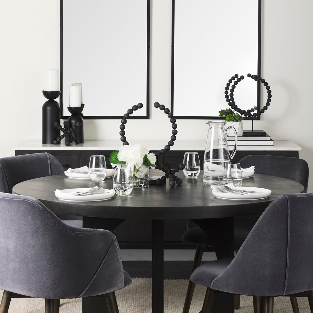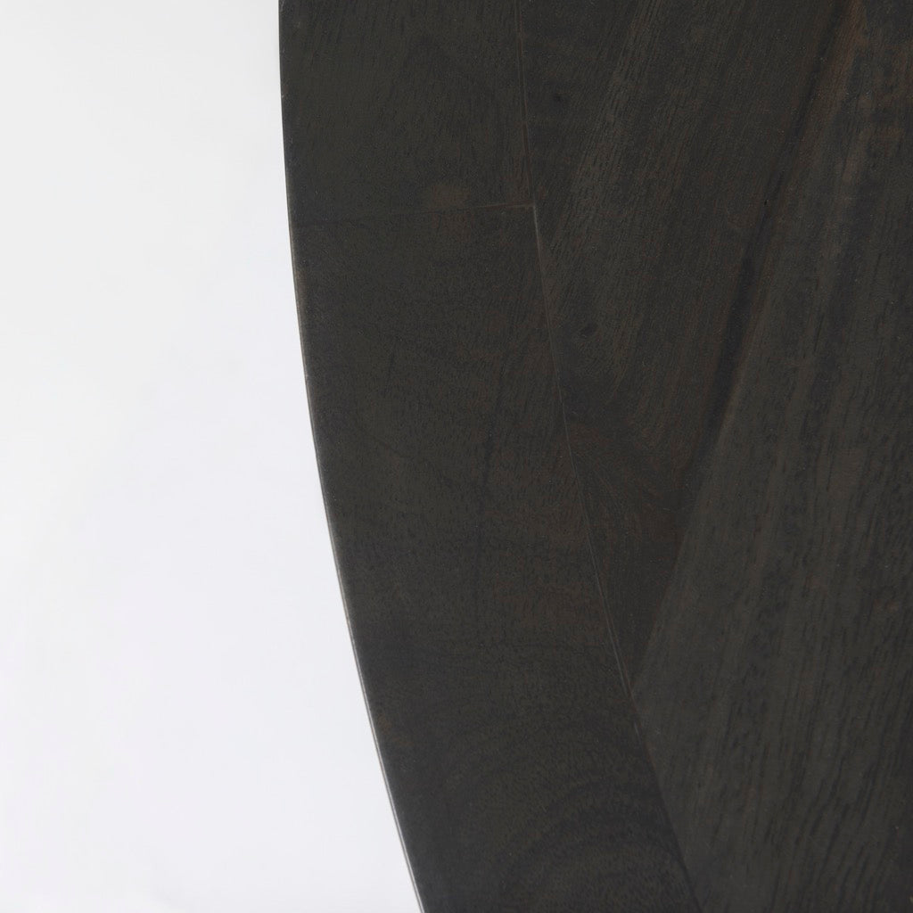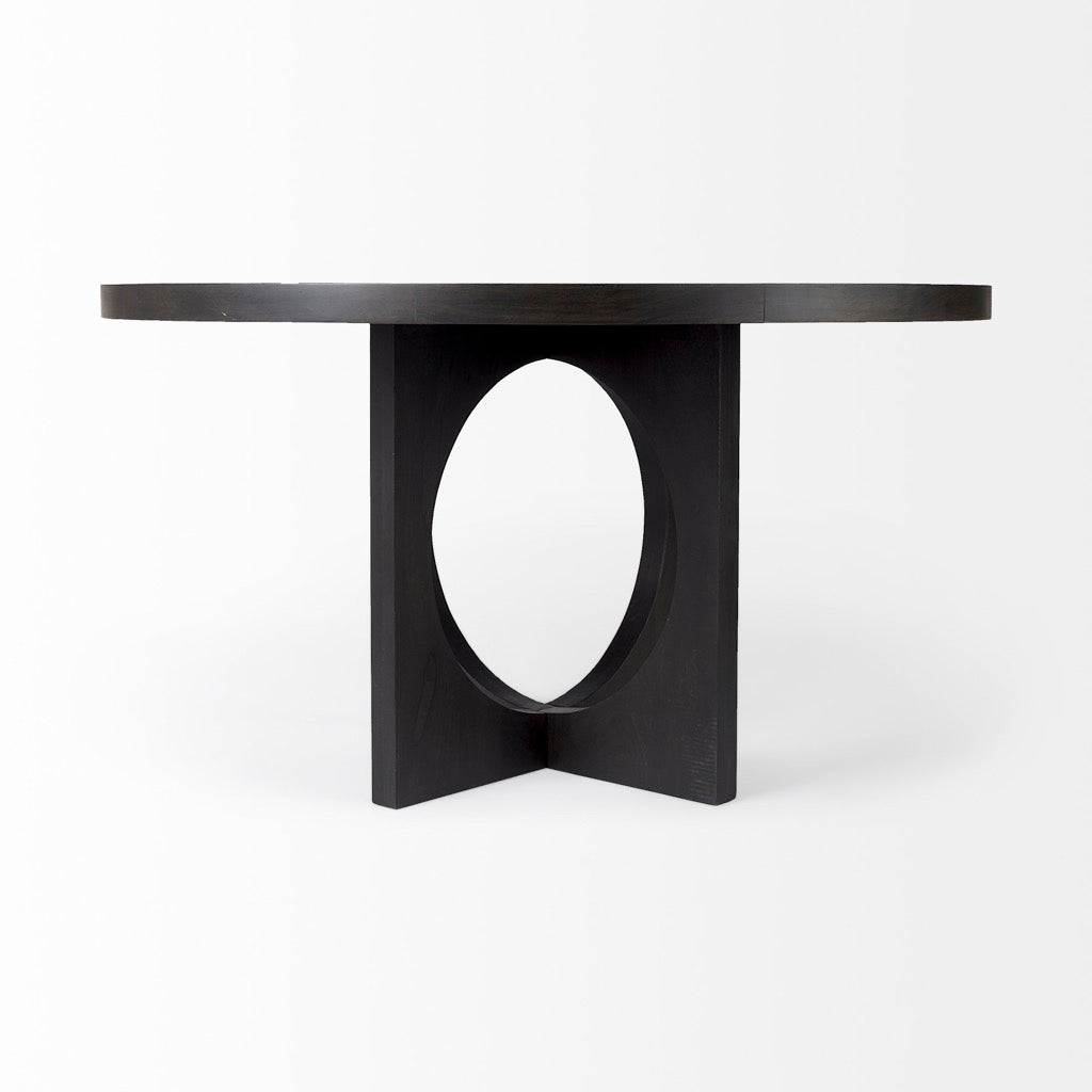 The Liesl is a round dark brown dining table made from solid Indian mango wood featuring a geometric base.
