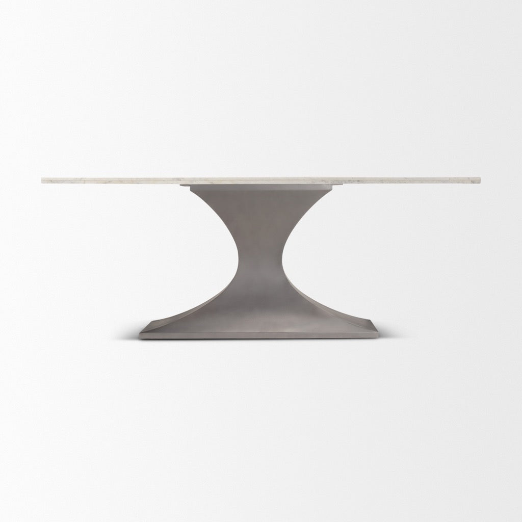 This Maxton pedestal dining table dining table showcases a marble top on a stylized gunmetal base.