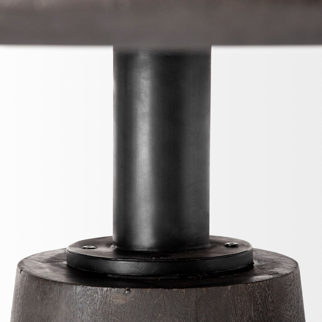 - Solid Wood Construction with Superior Finish: This stylish dining table flaunts a sleek, beveled edge top finished in a medium brown tone that highlights the solid wood's grain pattern and knots which is complemented by the charcoal grey finish on the pedestal.