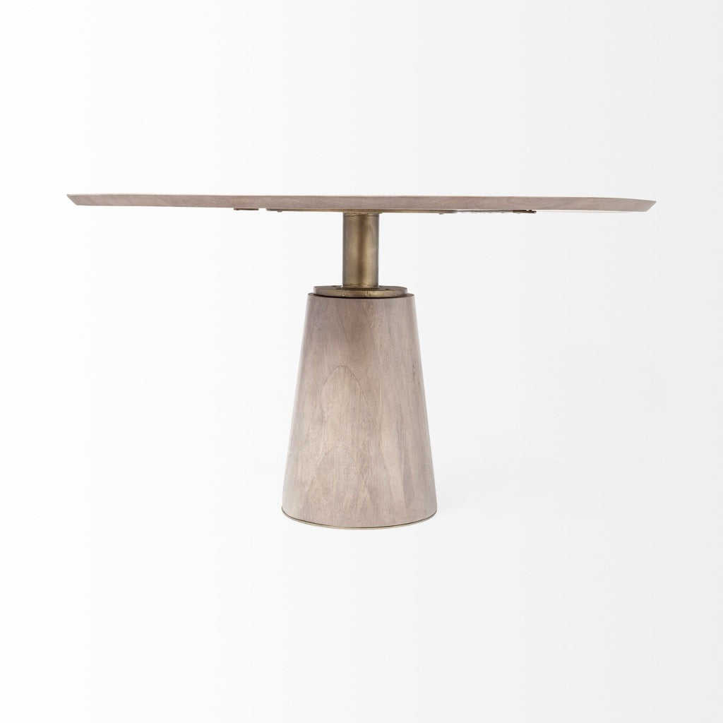 - Pedestal Base: The Maxwell Dining Table features a round, solid wood top that is braced by a stunning tapering pedestal made of solid wood.