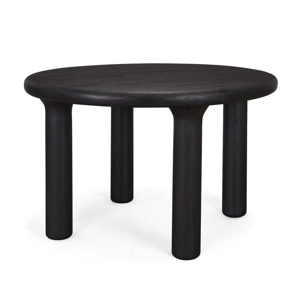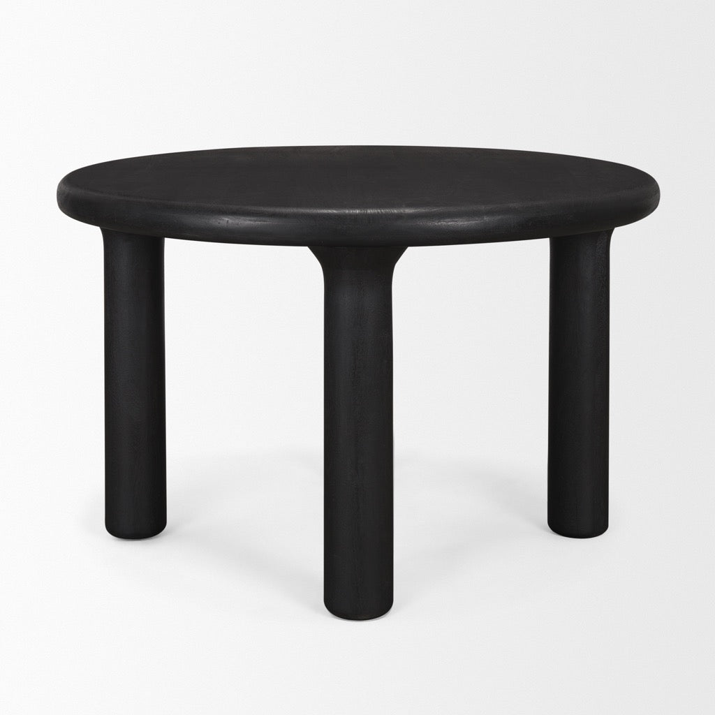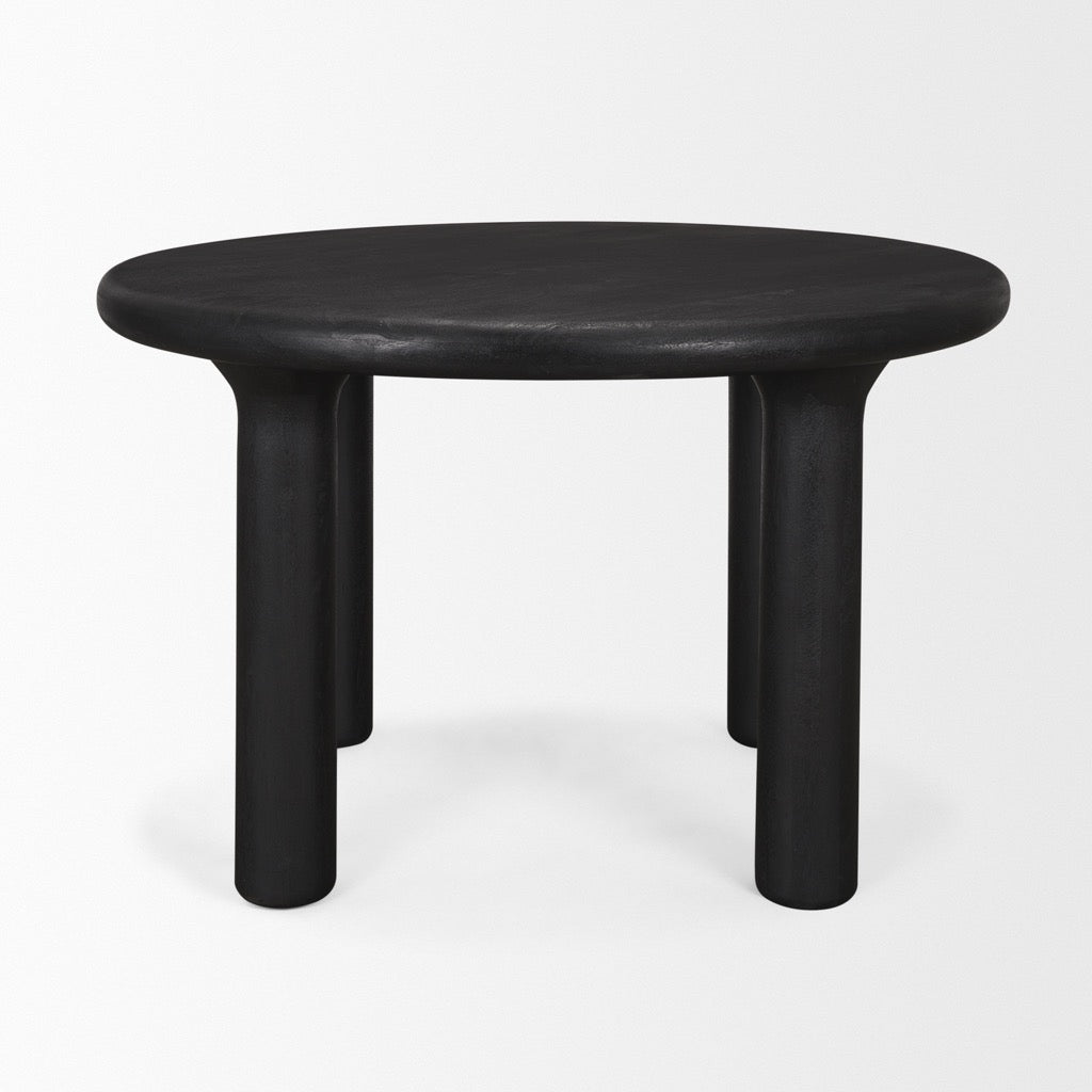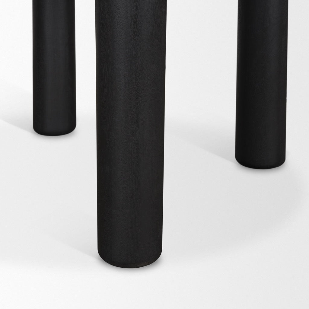 Soma is a round dining table that is expertly crafted from solid acacia wood. Known for its captivating tonal contrasts and grain variations, the striking black finish imparts depth while the sandblasted texture accentuates the distinct character of the acacia wood. The graceful contours of the pillar-style legs seamlessly meld into the tabletop, creating the illusion of a singular, cohesive unit.