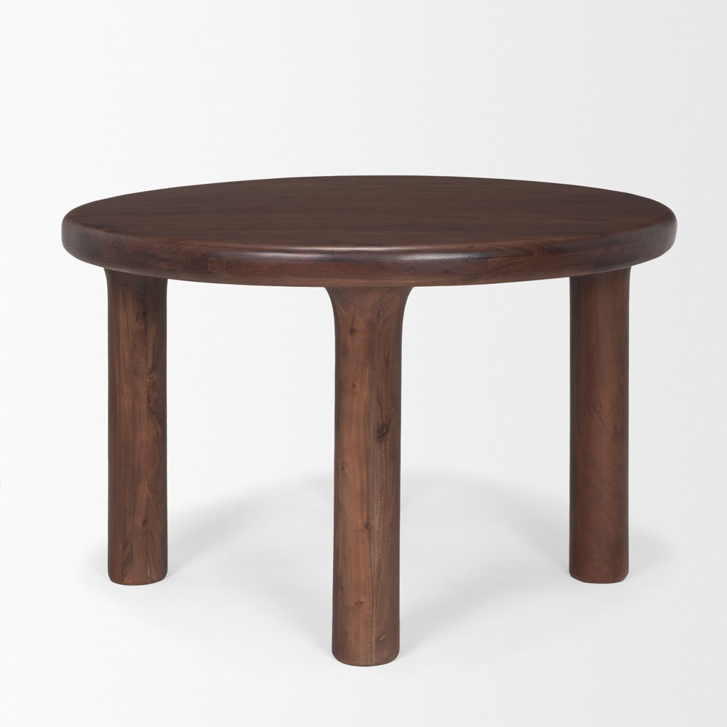 Soma is a round dining table that is expertly crafted from solid acacia wood. Known for its captivating tonal contrasts and grain variations, the rich red-brown stain accentuates the distinct character of the acacia wood. A smooth finish harmonizes with the graceful contours of the table, where its pillar-style legs seamlessly meld into the tabletop, creating the illusion of a singular, cohesive unit.