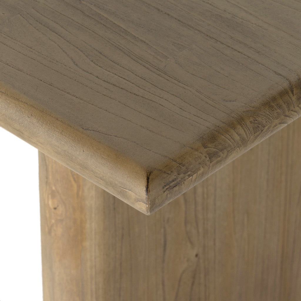 Clean edging and soft curves spur a remarkable contrast. Solid aged grained mindi forms an open, minimalist-minded dining table with grand proportions above arched bases. Seats 8-10 comfortably.
