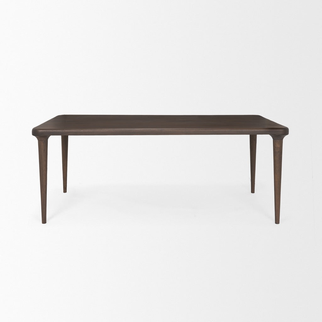 Suvan is a sleek dining table, crafted from solid mango wood, featuring a rich medium-dark brown stain that exudes elegance. Its smooth, matte finish enhances the dark hue while accentuating the table's rounded edges. Supported by four tapered spindle legs, Suvan boasts an open and airy profile, perfect for creating a welcoming dining atmosphere.