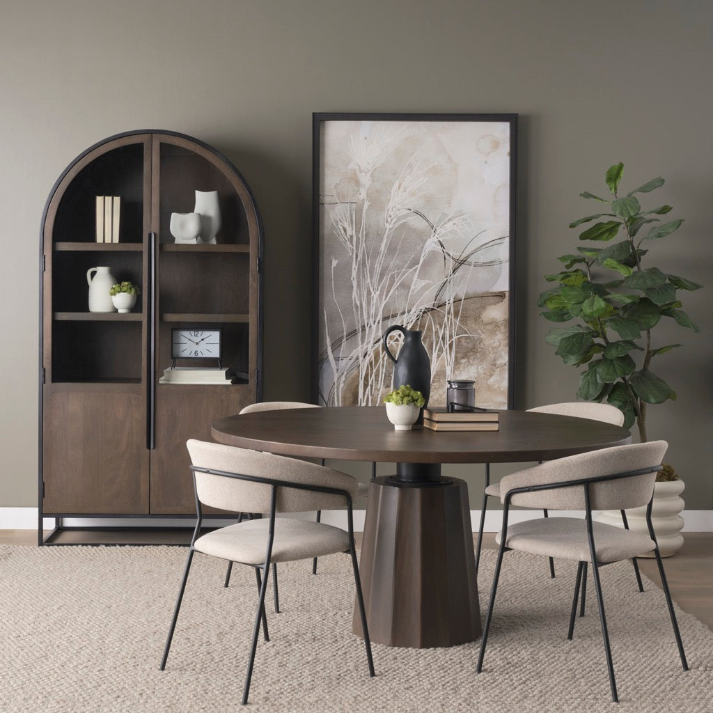Swanson, a stunning statement piece for your dining room, is crafted from solid mango wood. This 60" round dining table boasts a masculine dark matte brown finish, enhanced by a sleek matte black iron metal neck. The tapered solid wood pedestal base adds a touch of elegance with its beautiful scalloped effect.