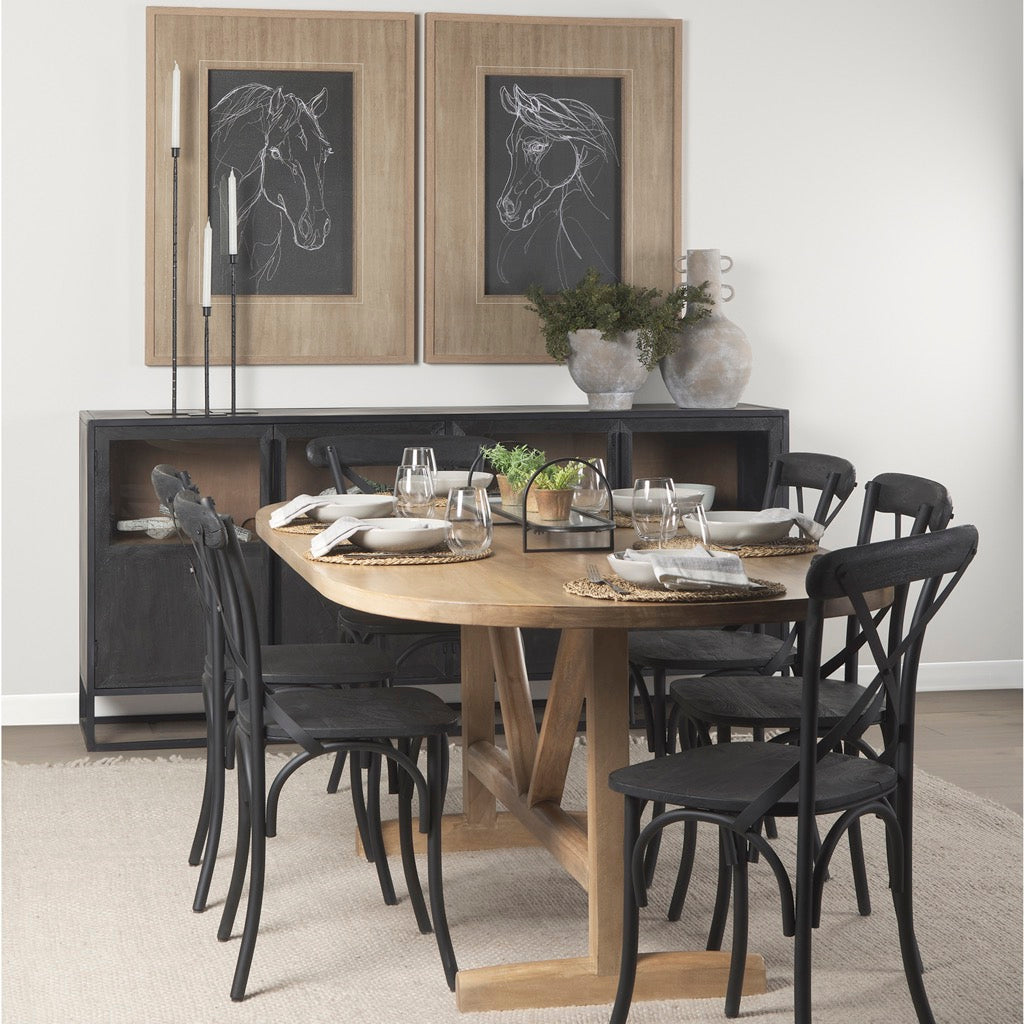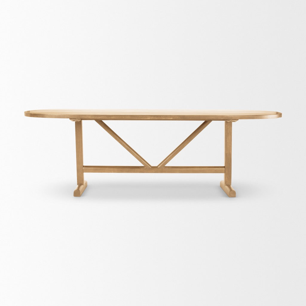 Beautifully simple, the Viktor Dining Table is fashioned out of solid mango wood. It features an oval top and two T-shaped legs, braced with an appealing V-shape design element. Light brown finish.