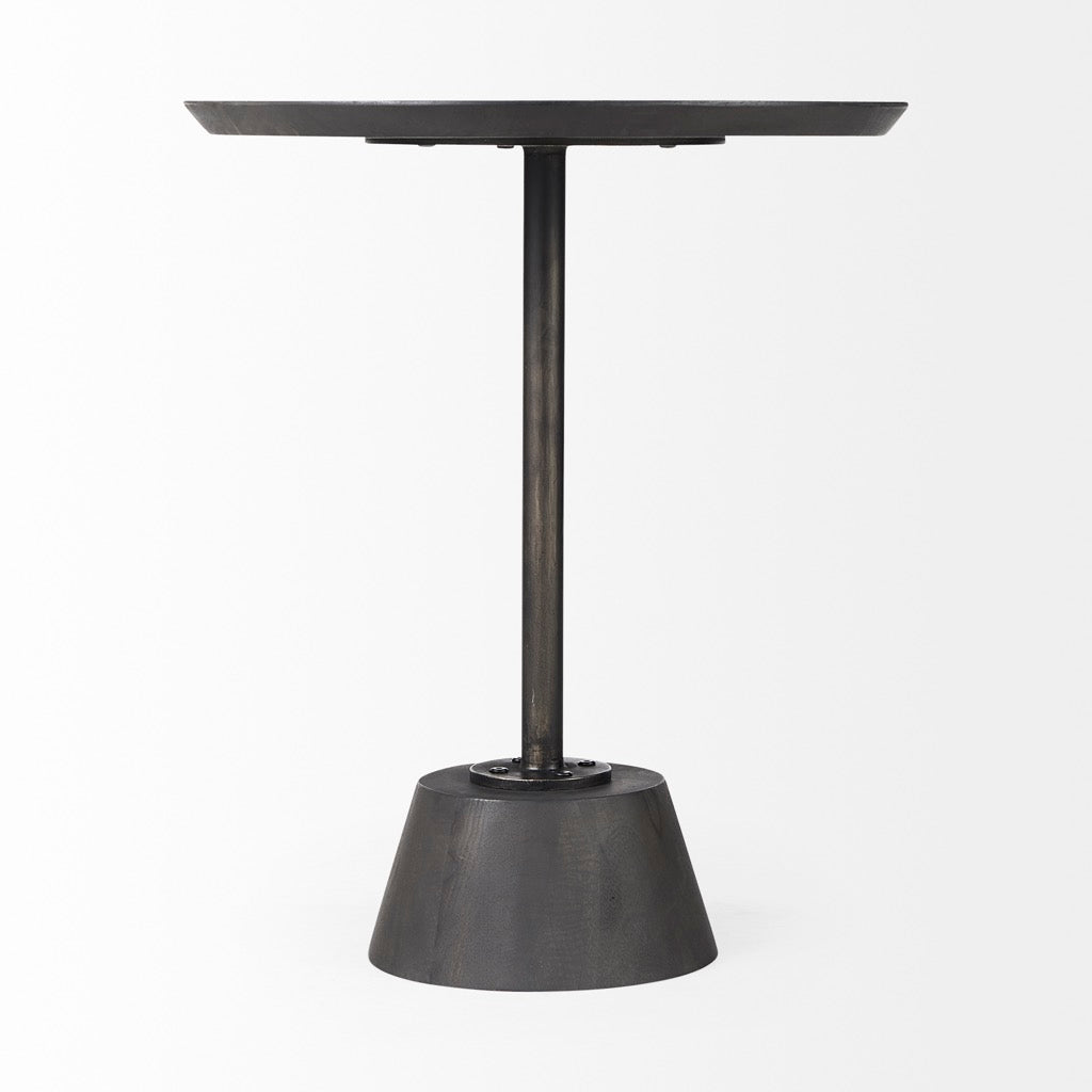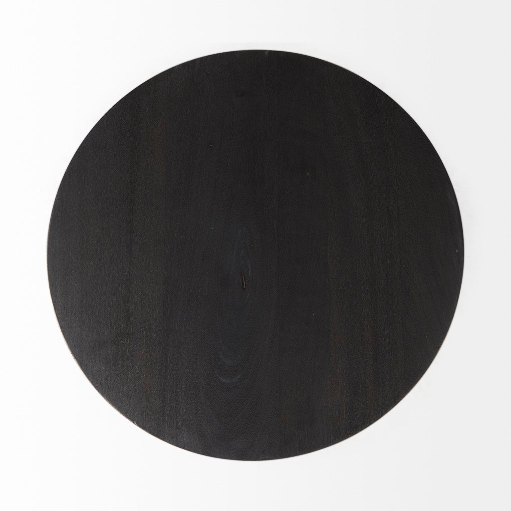 - Solid Wood and Metal Construction: This side table's simple, round top, made from solid Mango wood, sits upon a slender iron rod anchored by a tapered wooden base in an understated, yet eye-catching design.