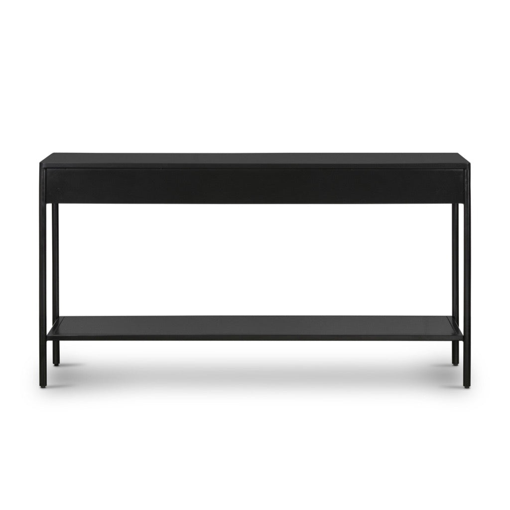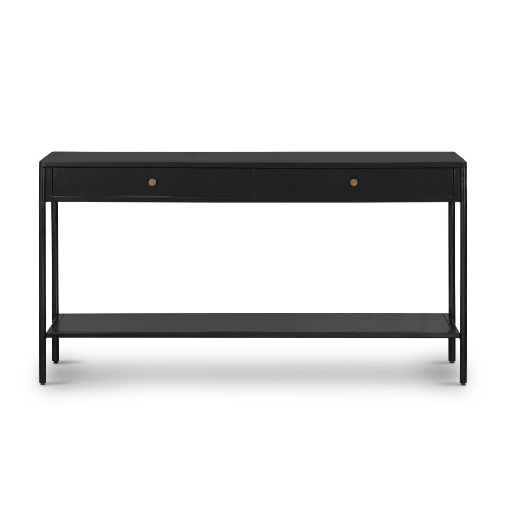 Bring a softened industrial look to the media room, dining space or entryway with a simple black-finished iron console table featuring bronzed iron hardware for modernity. Dual drawers and lower shelving add bonus storage space.