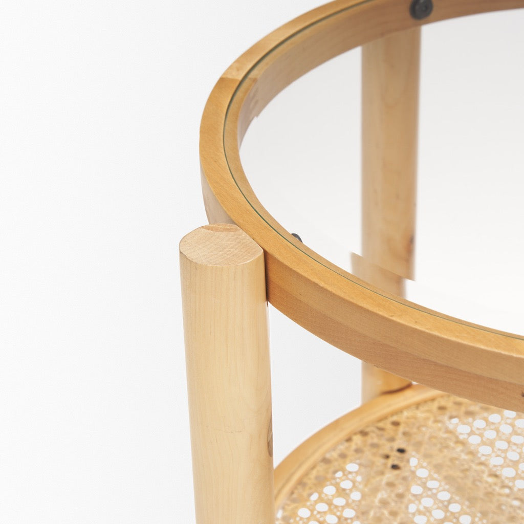 Weslyn is a round, light brown solid birchwood side table with a woven cane bottom shelf and smooth, clear glass tabletop.