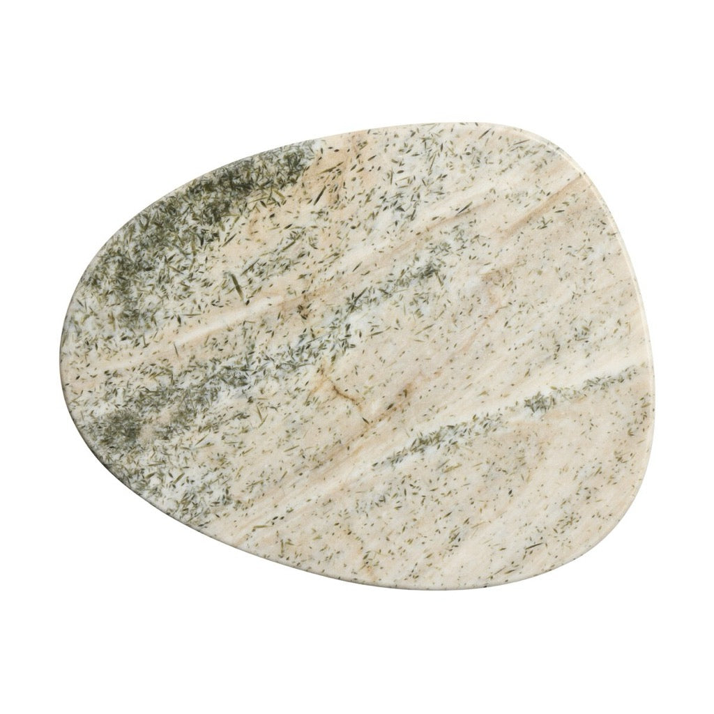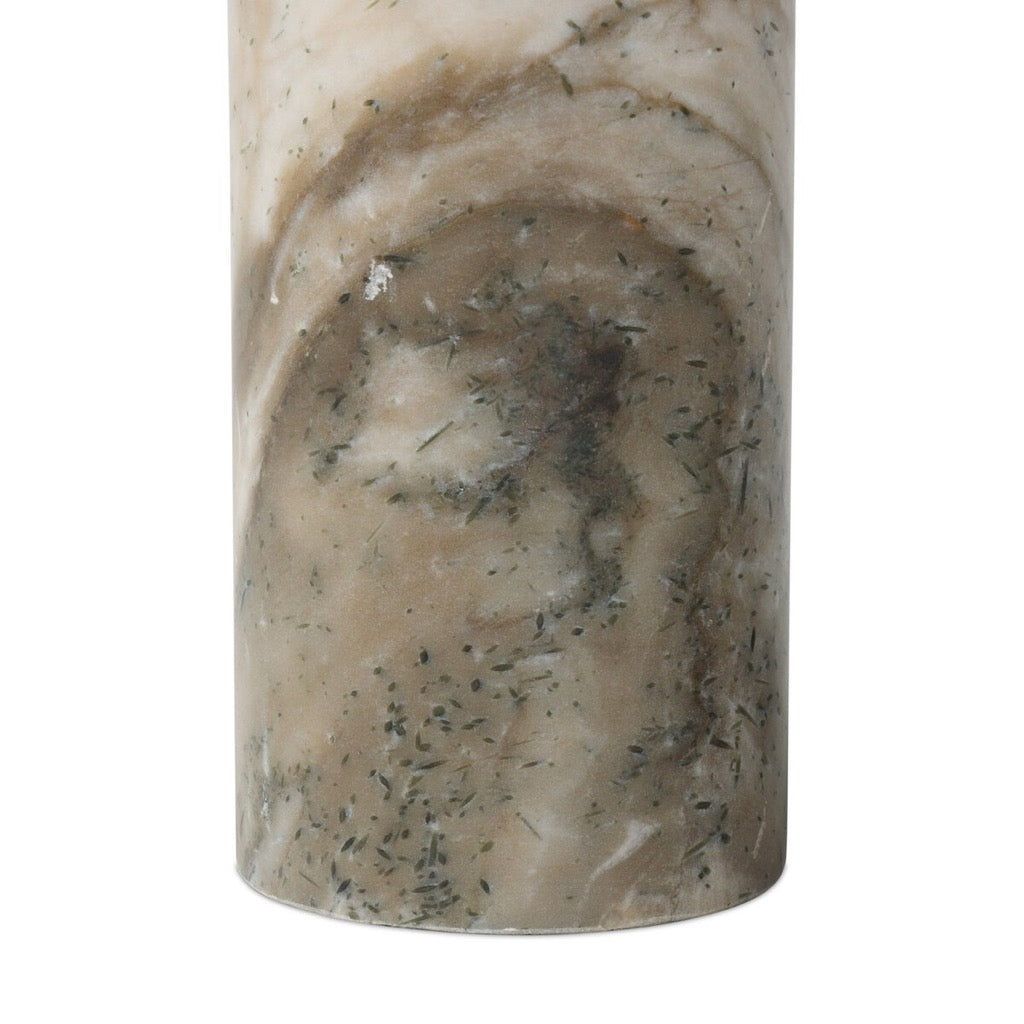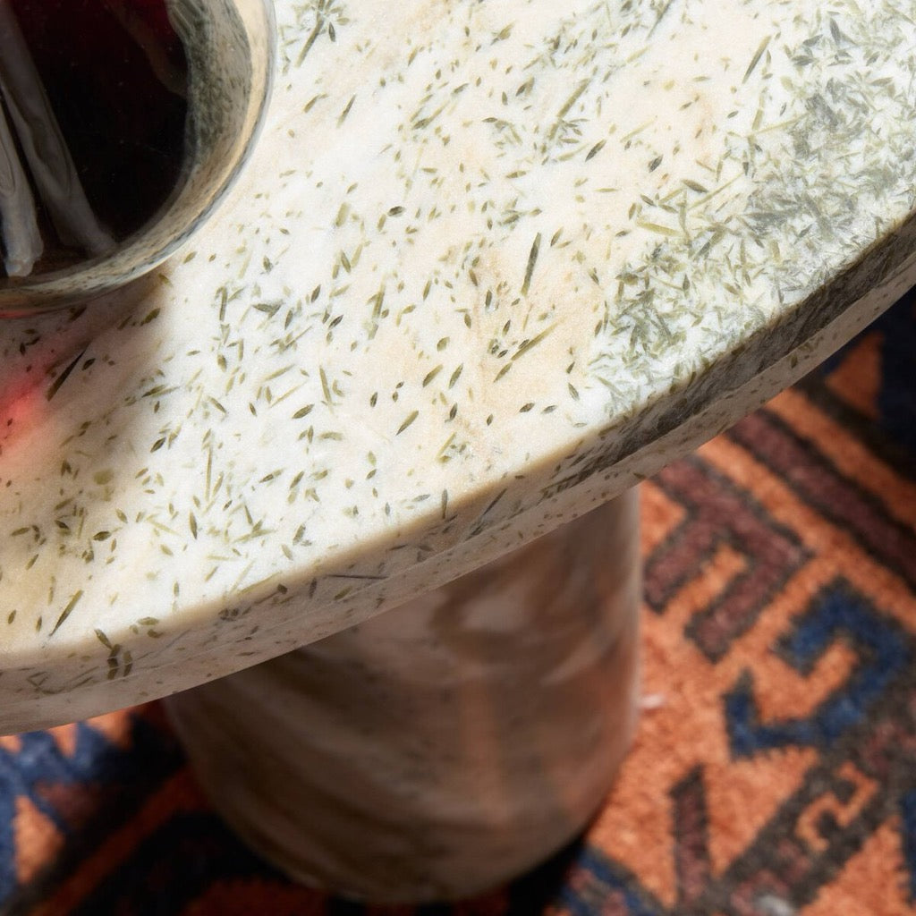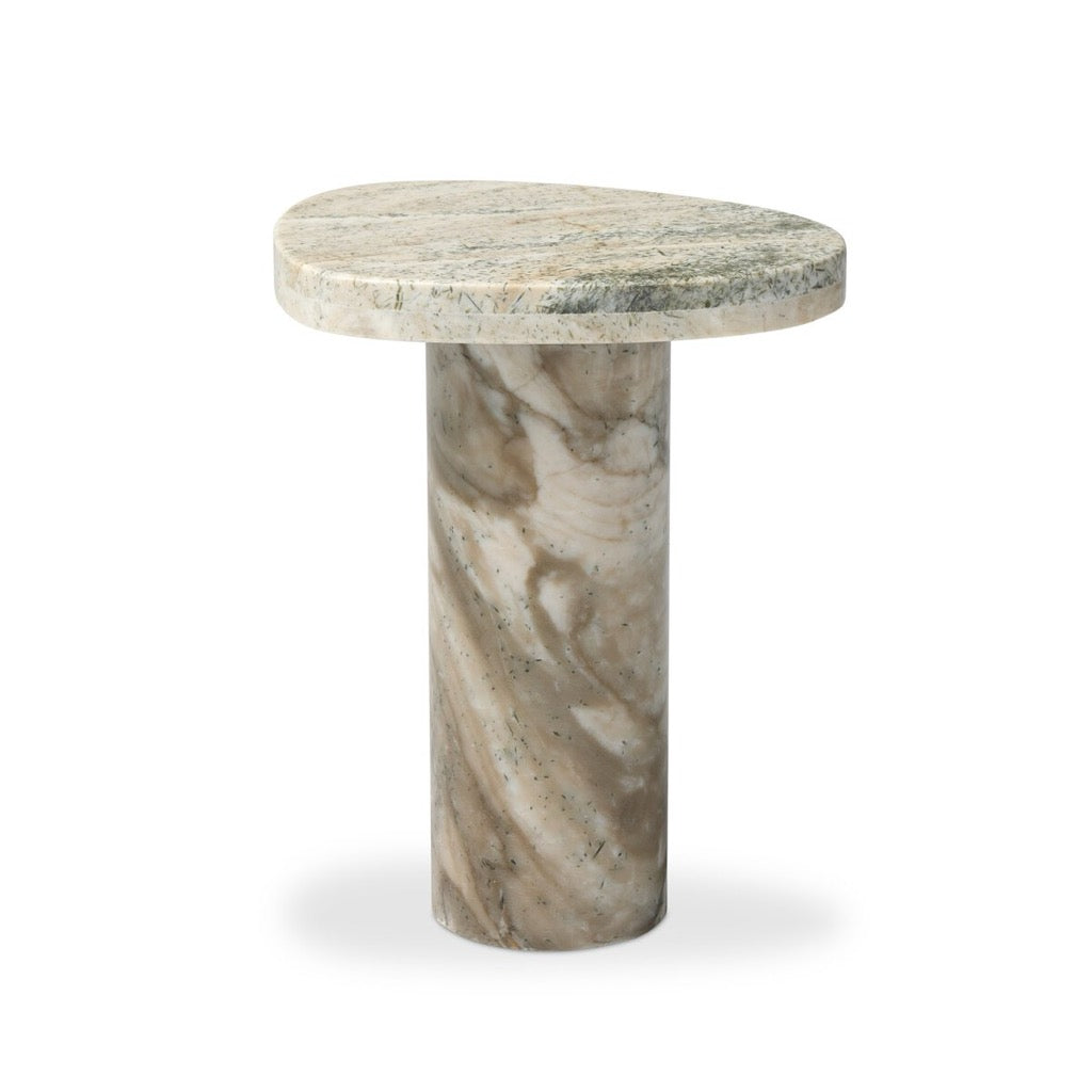 Shape and material share the spotlight in this pedestal-style end table of solid marble finished in a sage onyx with natural veining.