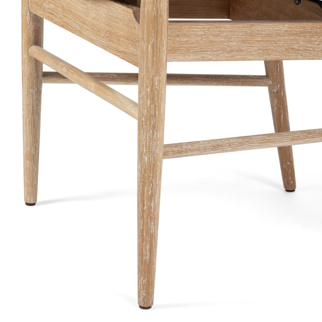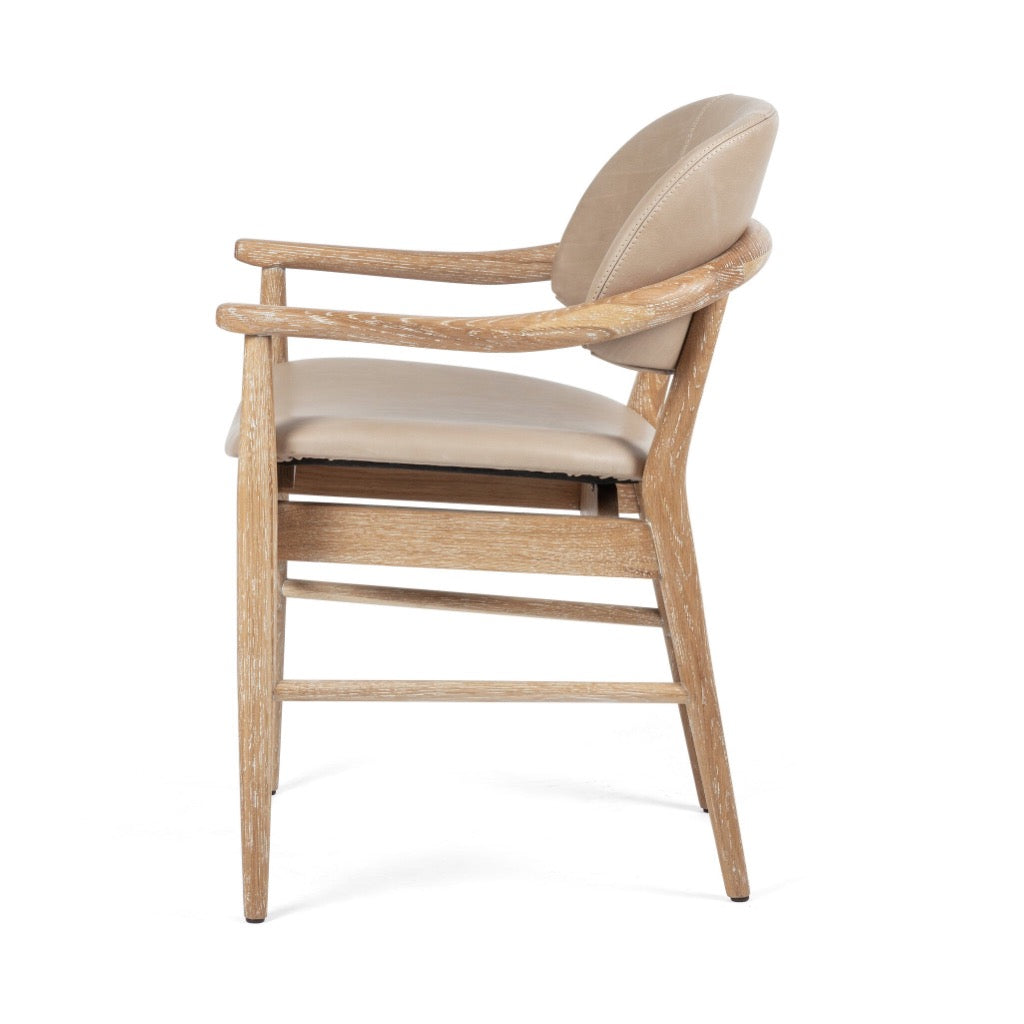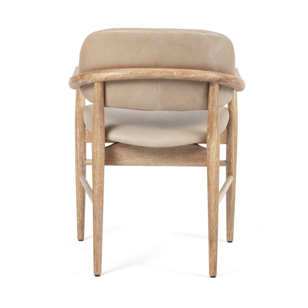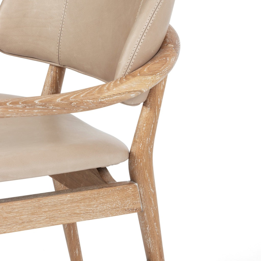 Mid-century vibes meet modern materials. Whitewashed oak frames float-like seating of top-grain leather in a versatile light tan, with sloped arms and cone-tapered legs adding to a beautifully sculpted silhouette.