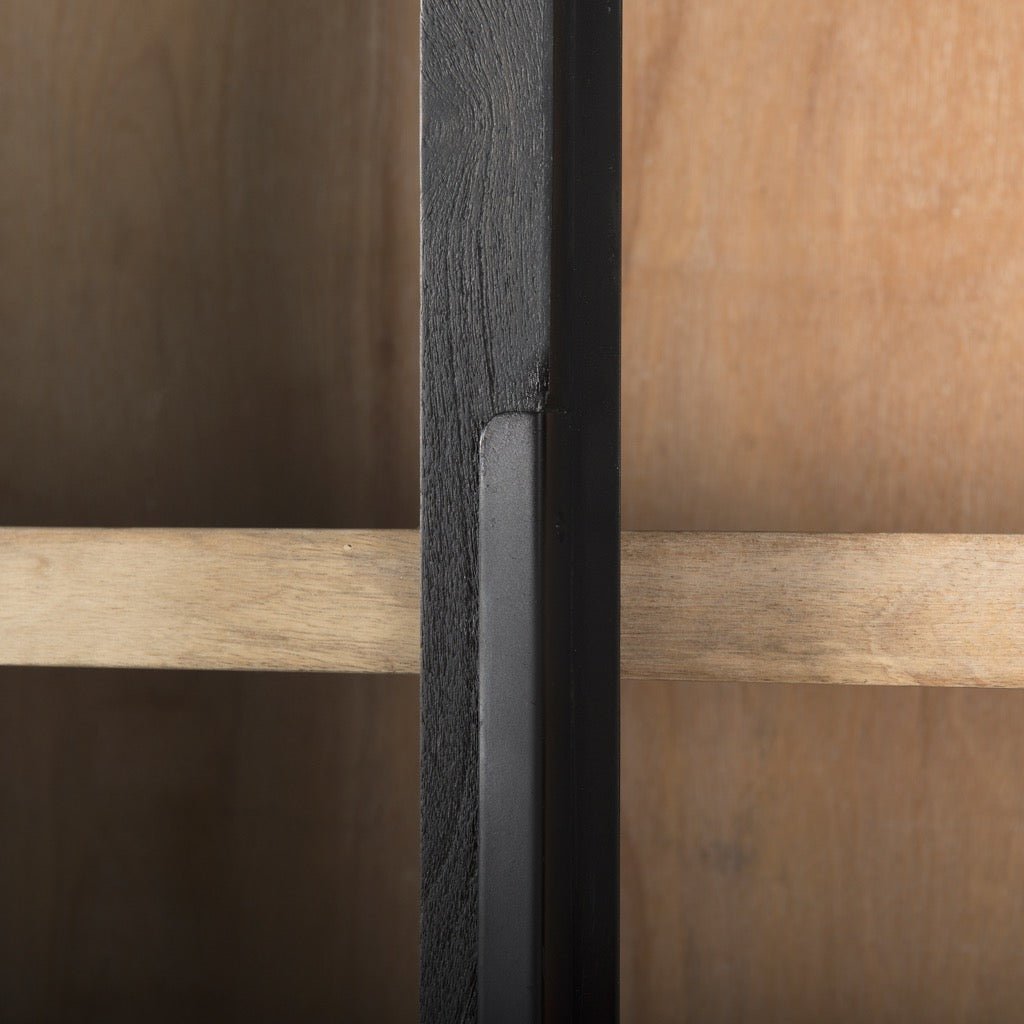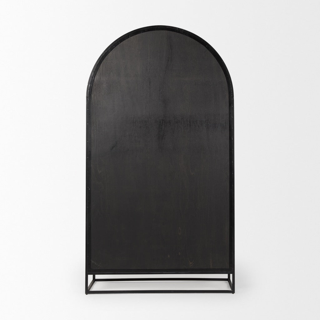 The Sloan Cabinet is a masterpiece of design with its clever use of materials and lofty aesthetic. This granddame features an arched cabinet that sits atop a modern iron base. The cabinet itself is made from a sturdy black iron, and is fronted by dark, solid mango wood doors. The doors feature a sleek iron grip and tempered glass that provide a window into the lighter solid wood interior. Once opened, the cabinet reveals a beautiful light brown inner, and removable shelves to show off much-loved curated pieces.