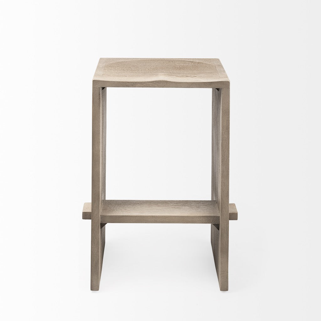 The rectangular shape of the Aida Counter Stool with unique leg and footrest design is made of durable Indian mango wood, finished in a light gray tone and fine sandblasted to feature subtle texture.