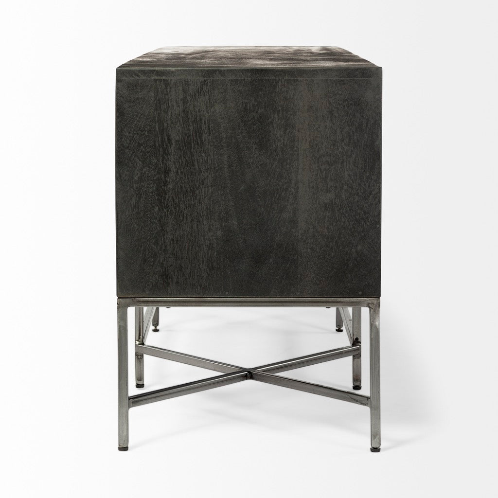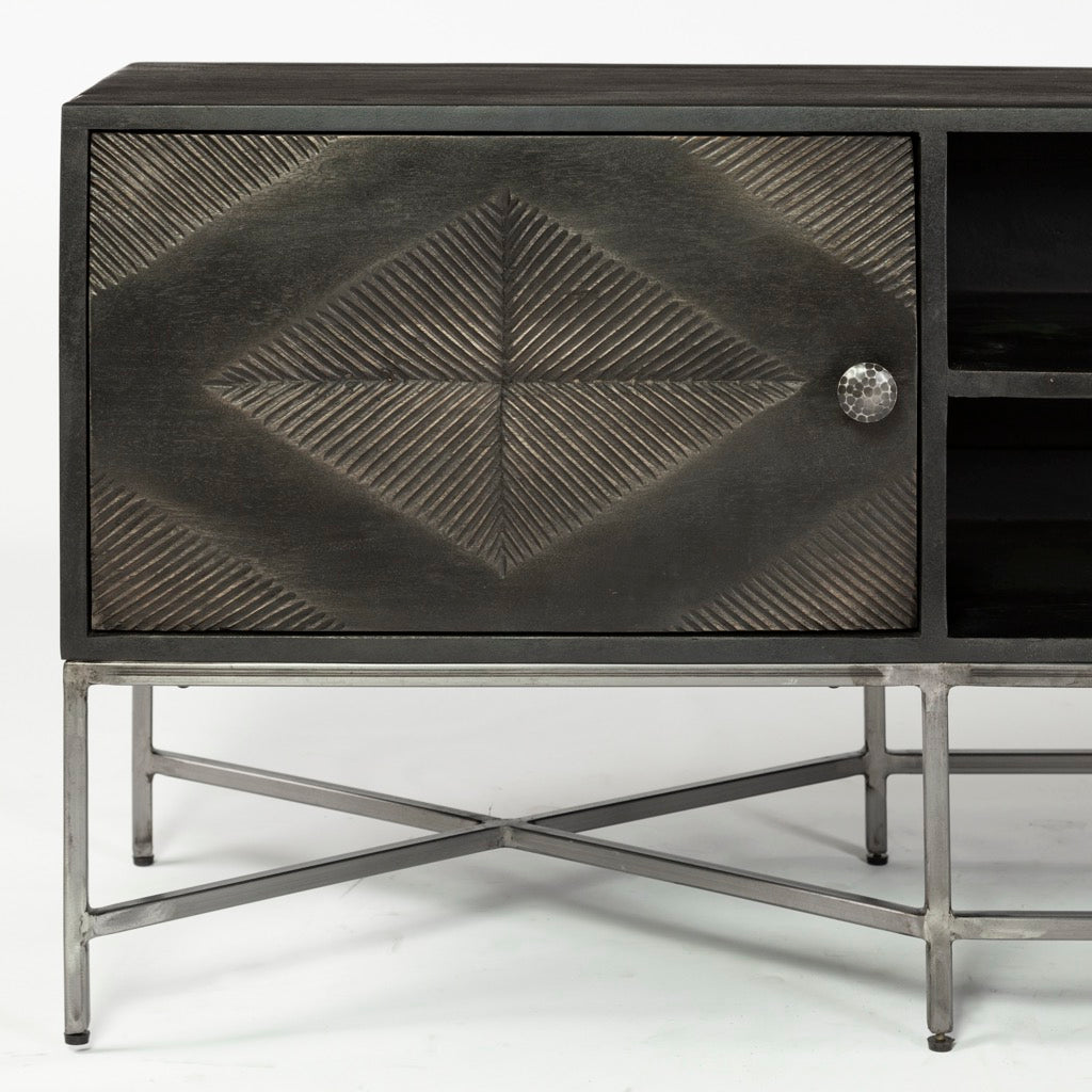 Hogarth I is a media console made from Indian mango wood with embossed diamond pattern doors.