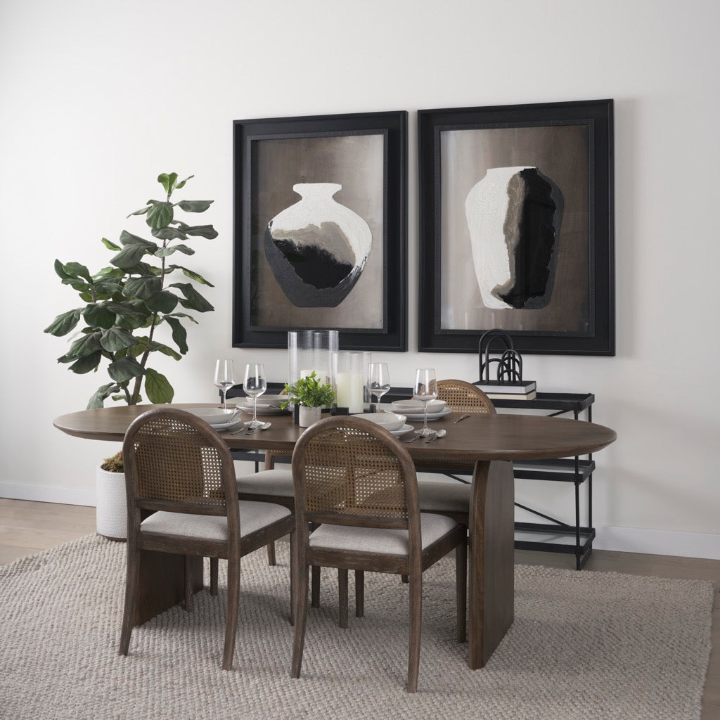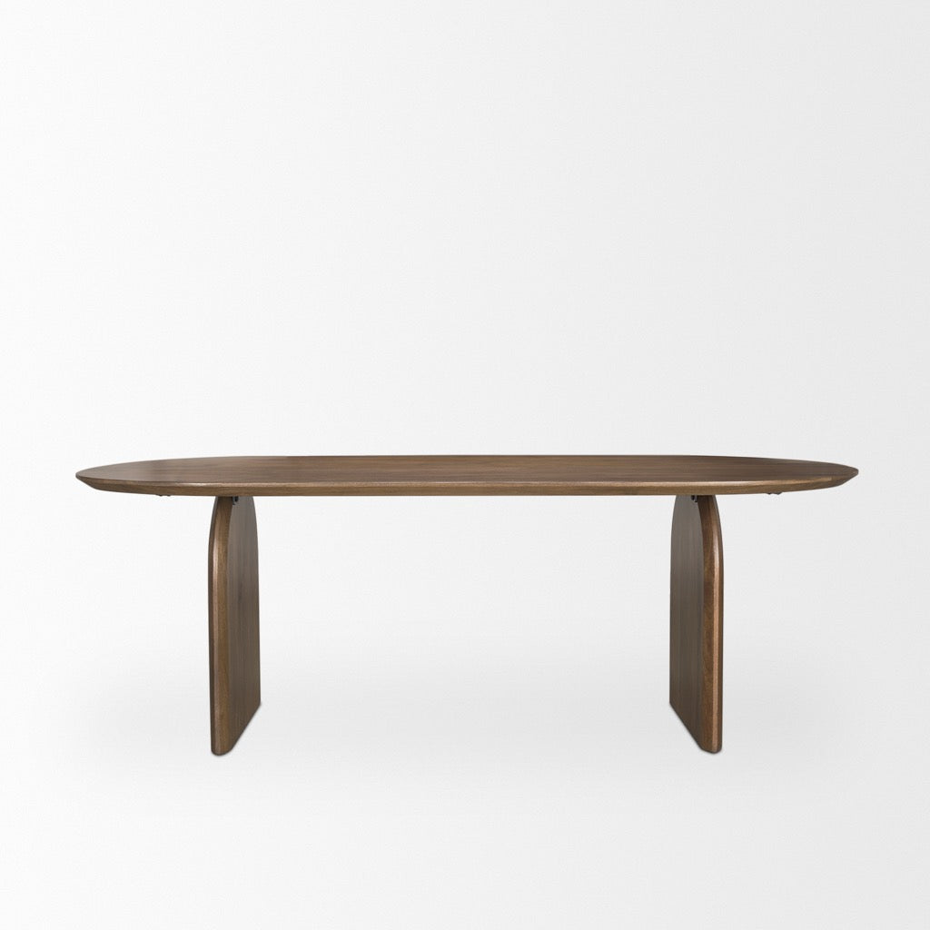 The Isla Dining Table is made of solid mango wood in a rich dark brown finish that does not disrupt the integrity of the wood's natural grain. This tasteful masterpiece boasts an inviting oval tabletop and gracefully slender arched legs, showcasing its captivating curvature as a defining attribute. Designed to comfortably seat six, the Isla Dining Table embodies a substantial yet inviting aesthetic, where graceful lines and impeccable construction converge to create a warm and welcoming atmosphere for your dining experience.