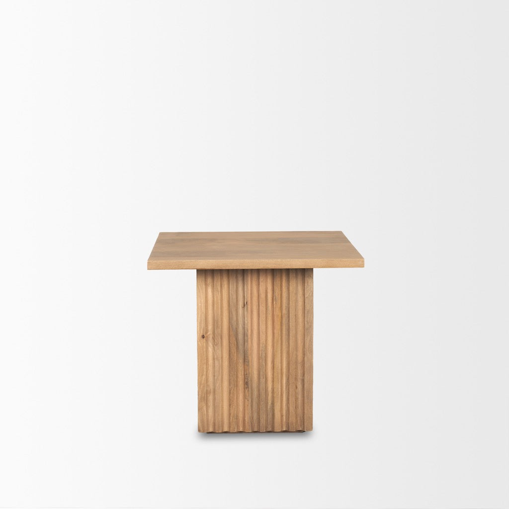 The June Side Table features a square tabletop and fluted square base, made of solid wood in a light brown finish.