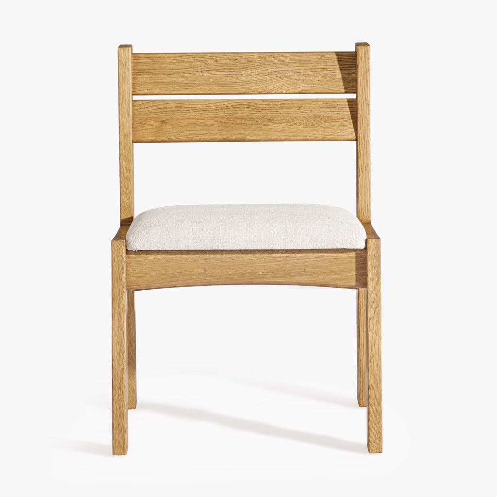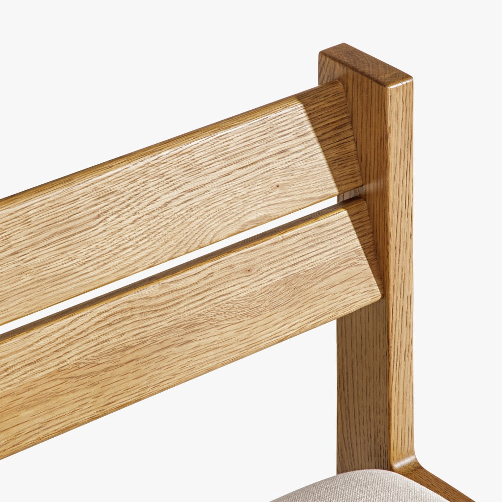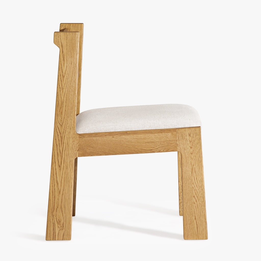 The Mobara Dining Chair features a minimalist oak wood frame with a slatted backrest and a neutral upholstered seat. Its timeless design blends effortlessly into modern and classic dining spaces.