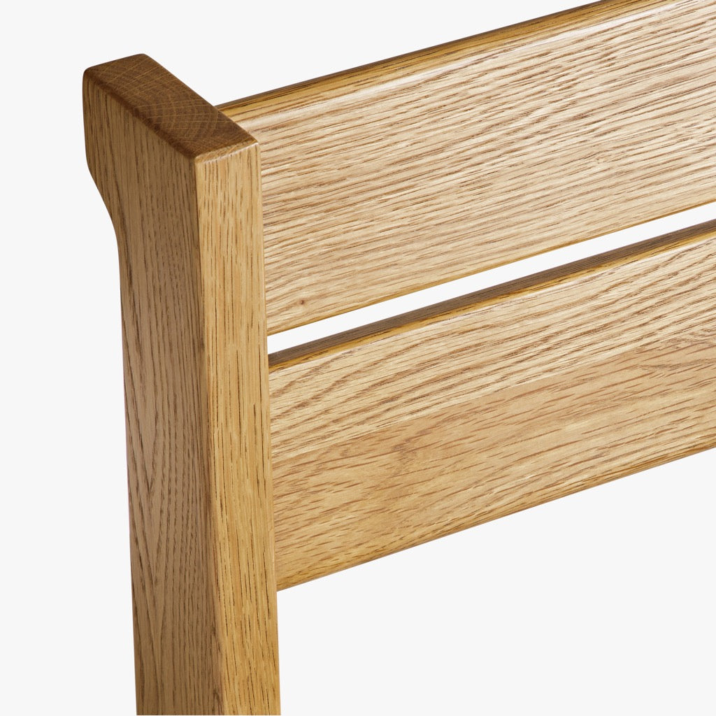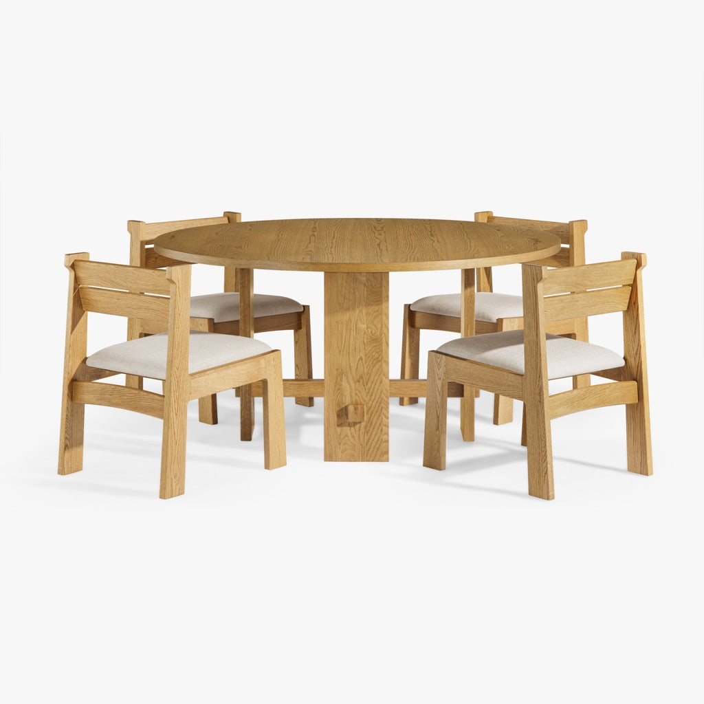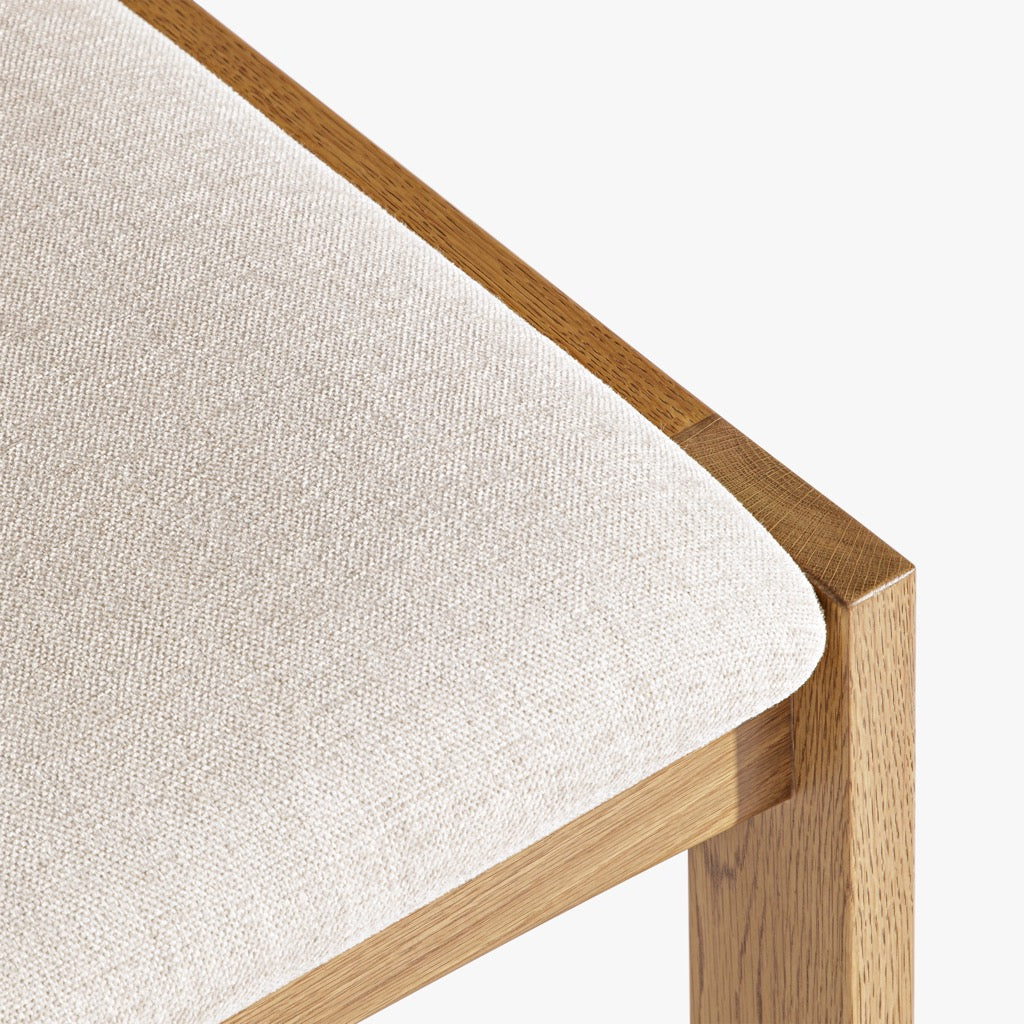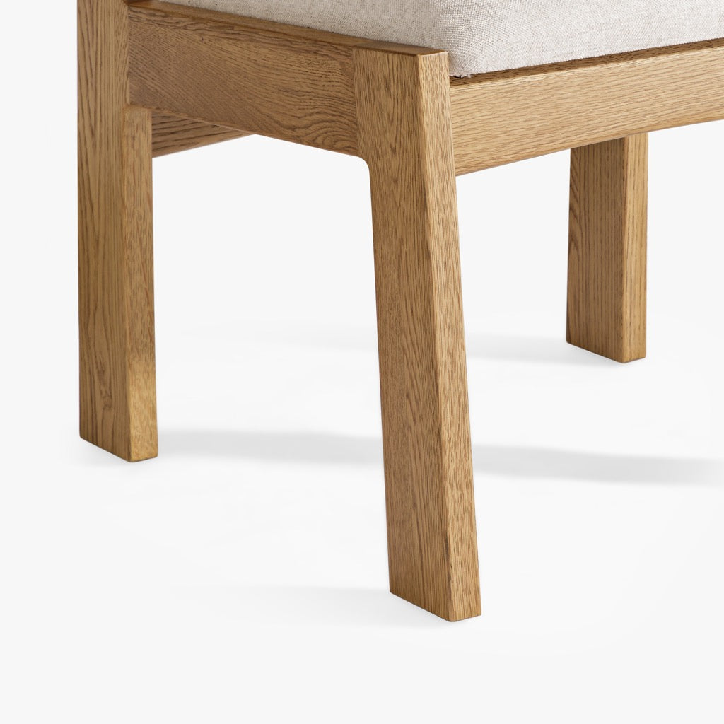 The Mobara Dining Chair features a minimalist oak wood frame with a slatted backrest and a neutral upholstered seat. Its timeless design blends effortlessly into modern and classic dining spaces.