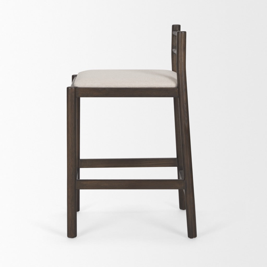 Sam Counter Stool with dark brown wooden legs and backrest finished with a cushioned cream fabric upholstered seat.