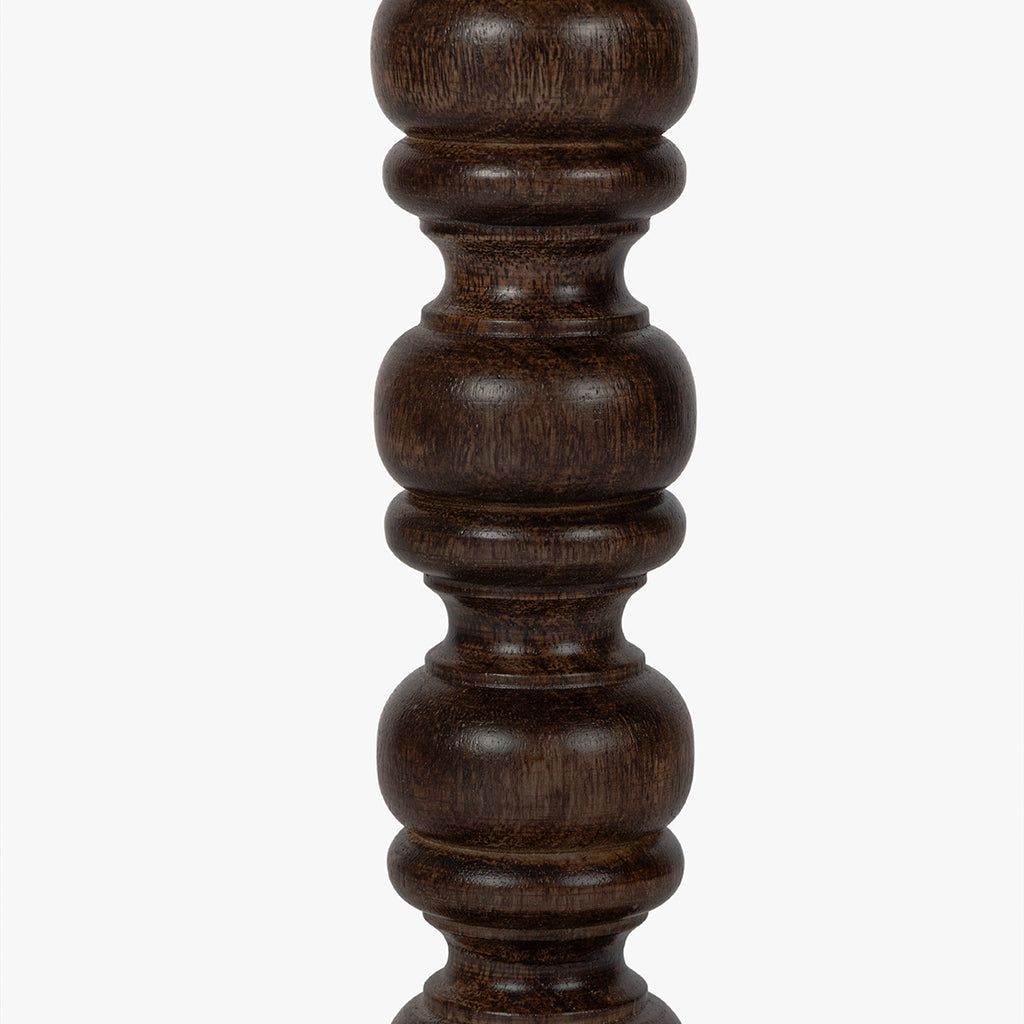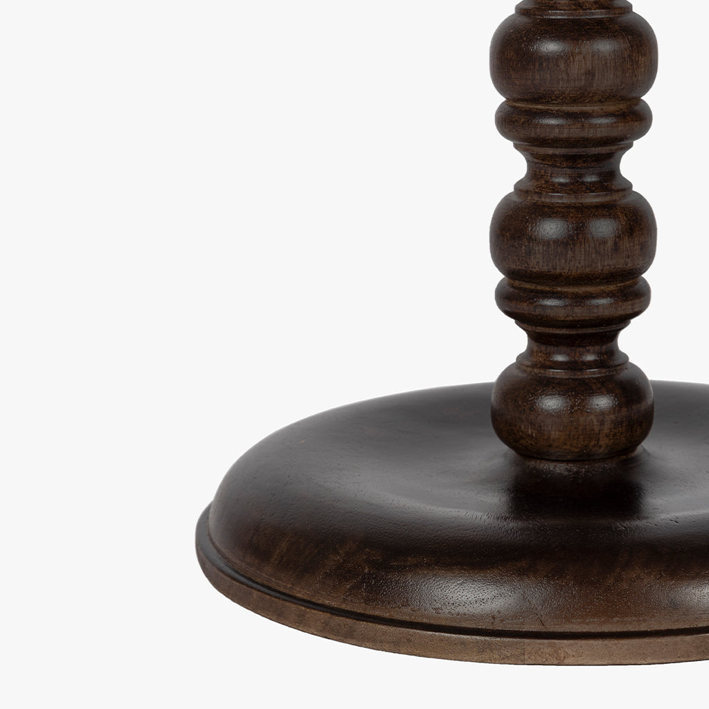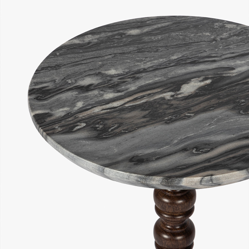This side table features a honed grey marble top with distinctive natural veining, supported by a sculptural, turned pedestal base crafted from solid tropical hardwood with a rich walnut finish; the combination of refined stone and warm, hand-finished wood creates a striking balance of elegance and character, ideal for both classic and eclectic interiors.