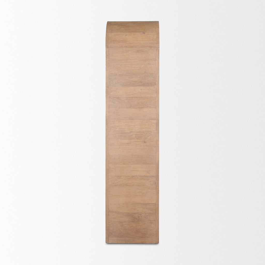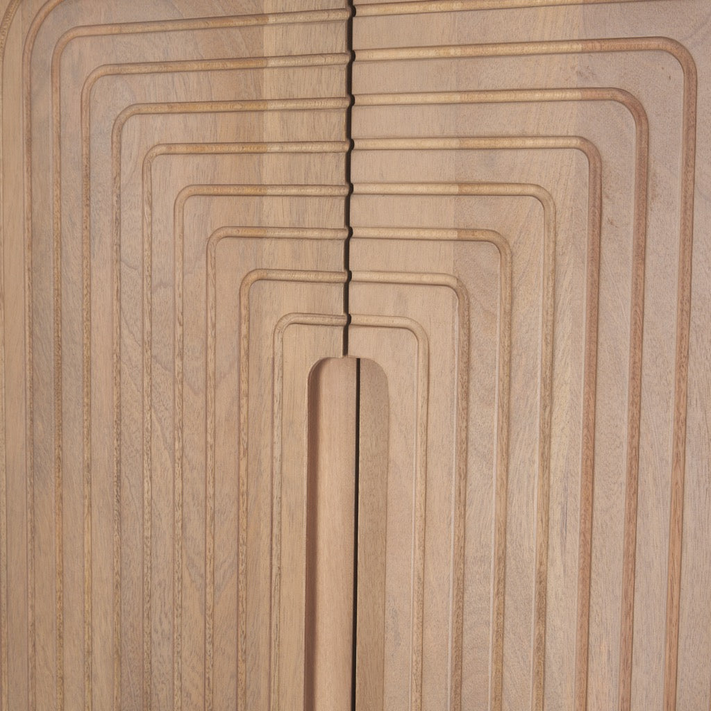 Sorina Curio Cabinet is crafted from solid mango with CNC doors, featuring a unique reverse fluted design that adds depth, texture, and character. Made from solid mango wood in a light brown finish, each door showcases the natural beauty of the wood, with recessed handles seamlessly integrated into the intricate fluted pattern. With two fixed and two removable shelves behind four doors, this modern yet grounded piece offers both style and functionality, making it a versatile addition to your home.