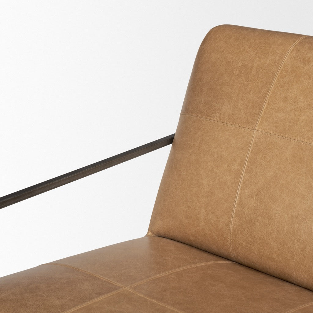 Stratton is an upscale accent chair enveloped in supple, full grain buffalo chestnut brown leather, upholstered in a captivating square patchwork pattern. The aged leather is complemented by a sleek but sturdy metal frame in a gunmetal gray finish that lends a modern touch. Whether placed in a corner or styled as a statement piece, the Stratton Accent Chair promises comfort, quality, and style. Also available in aged black leather.